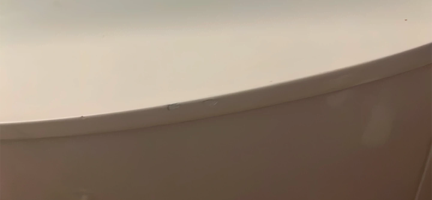 This unique dresser features a curved design with a white finish. It has six drawers for storage and a smooth glass top. Some minor scuffs are present on the top edge.