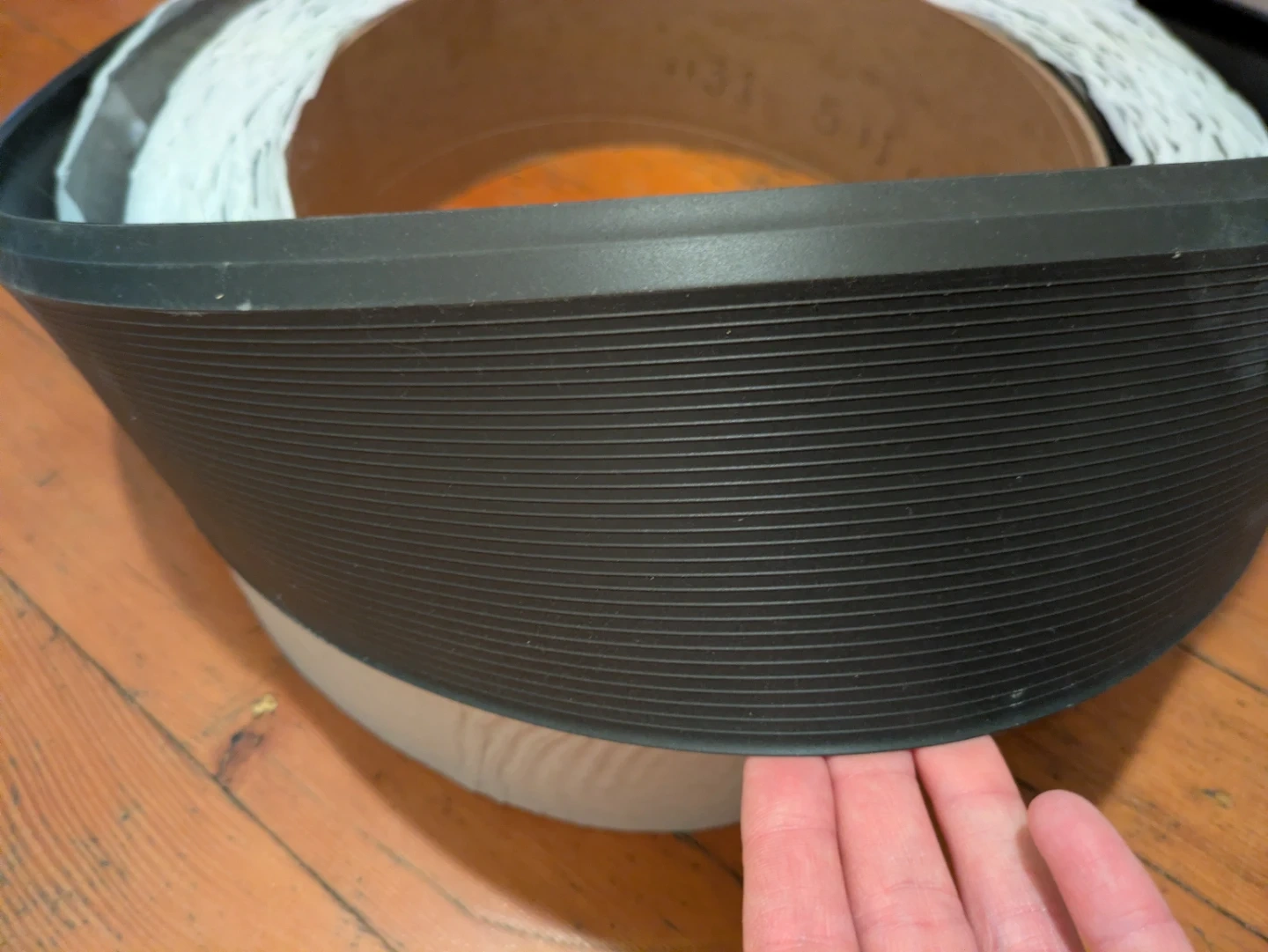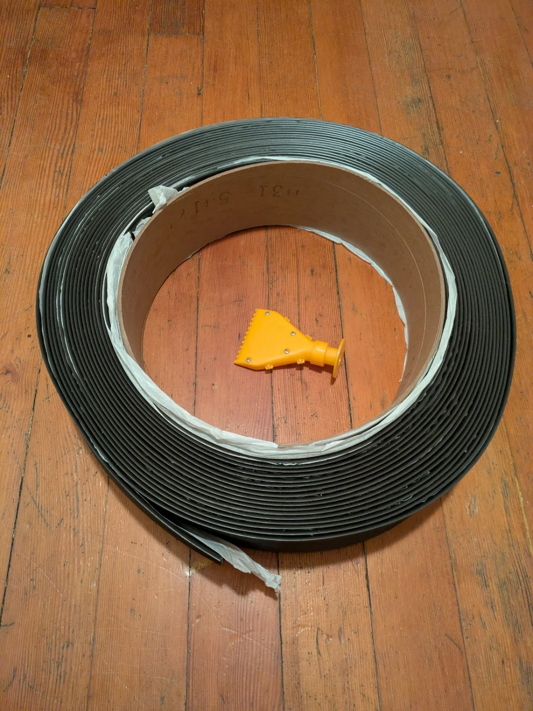 80ft+ Black 4inch rubber molding trim. Great for baseboards or steps. Includes a yellow plastic application tool. Material is flexible and easy work with. No glue included.