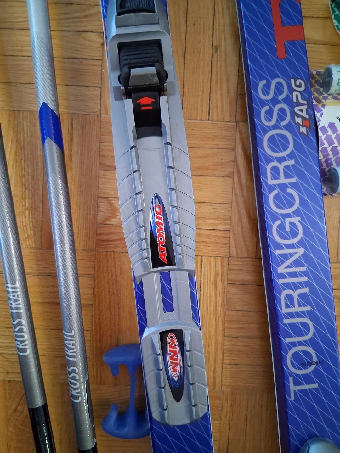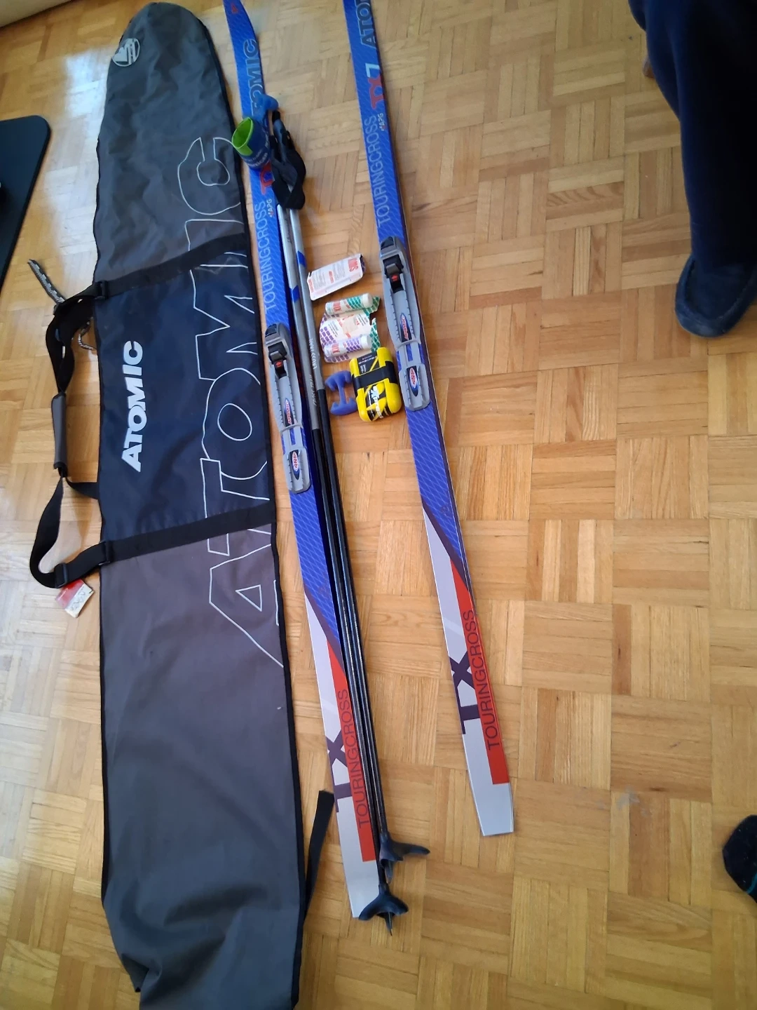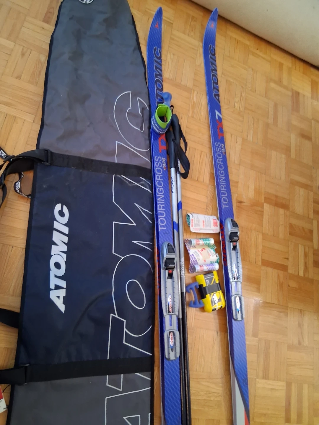 Atomic TouringCross skis with poles and a carrying bag. Includes various ski accessories. Ready for your next backcountry adventure!