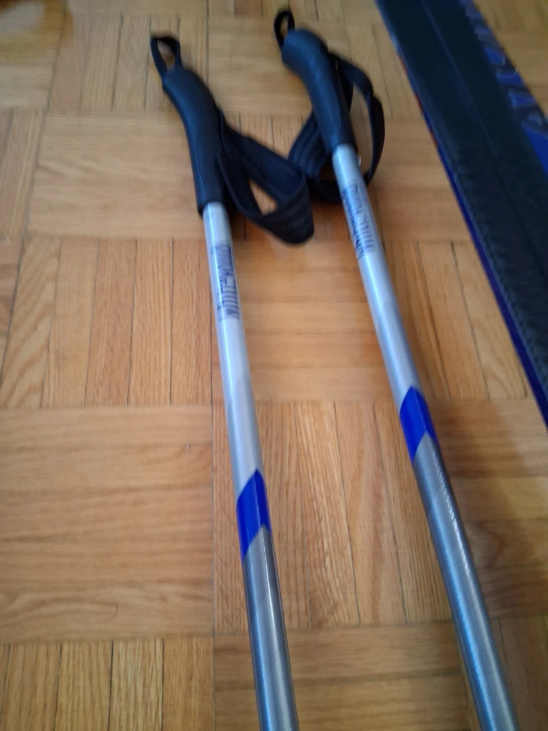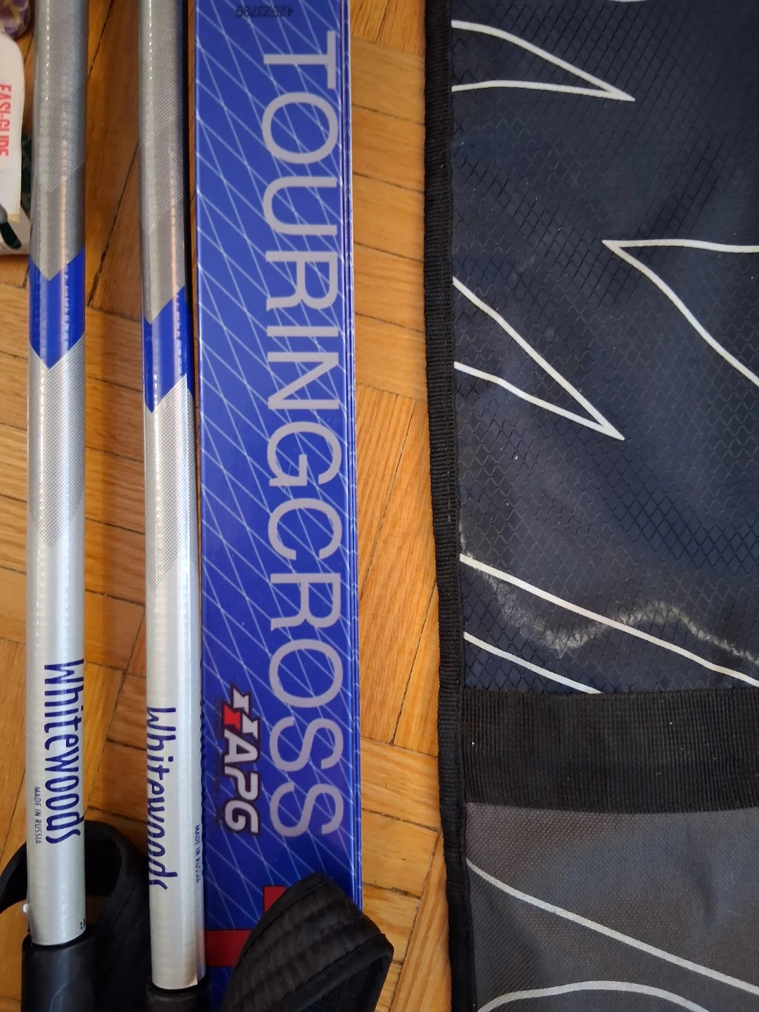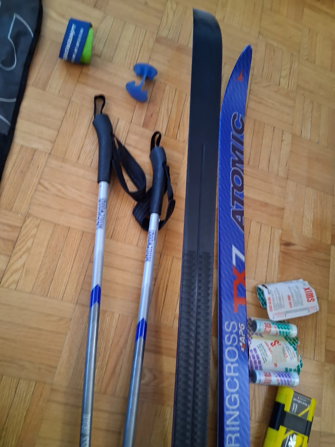 Atomic TouringCross skis with poles and a carrying bag. Includes various ski accessories. Ready for your next backcountry adventure!