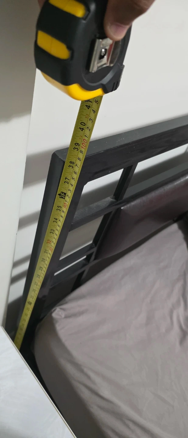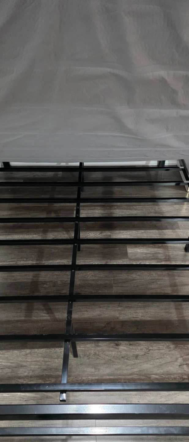 Selling a double size bed frame with a mattress. The bed frame is black and appears to be made of metal. The mattress has a patterned design.