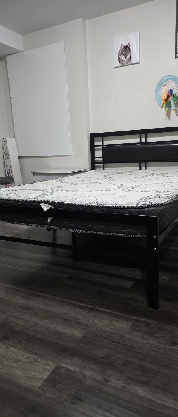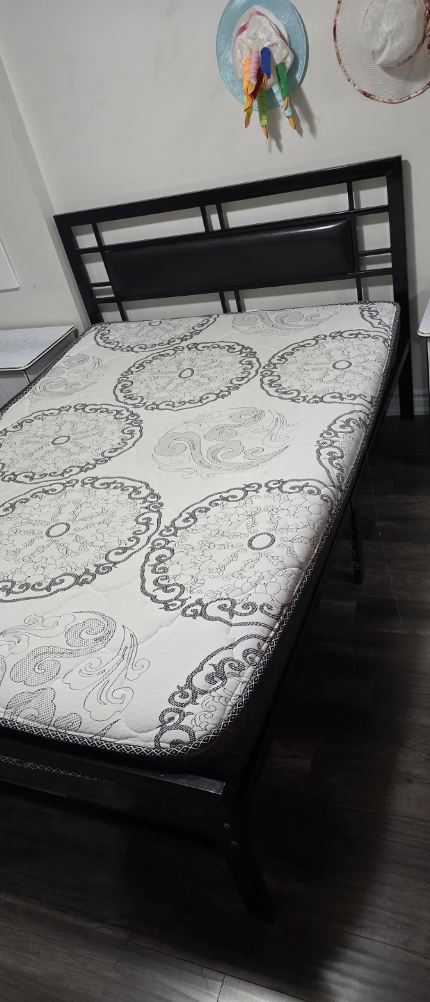 Selling a double size bed frame with a mattress. The bed frame is black and appears to be made of metal. The mattress has a patterned design.