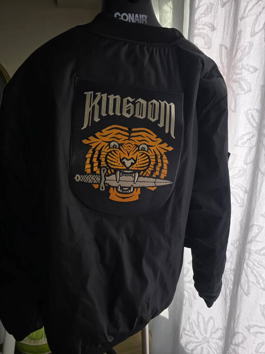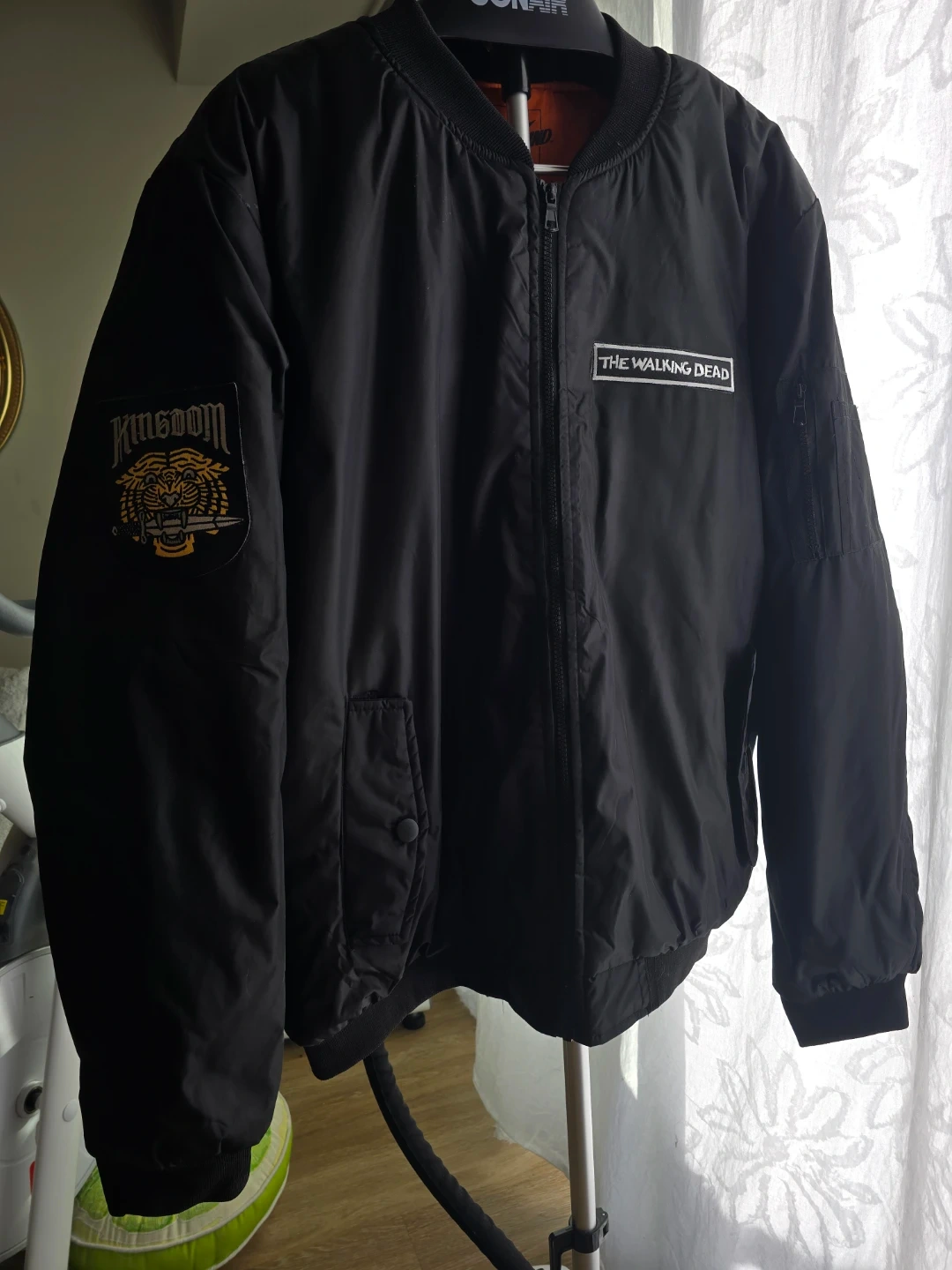 Black bomber jacket with 'The Walking Dead' patch on the chest and a tiger graphic patch on the sleeve. It's a size XL with an orange lining and zombie hand graphic on the back.