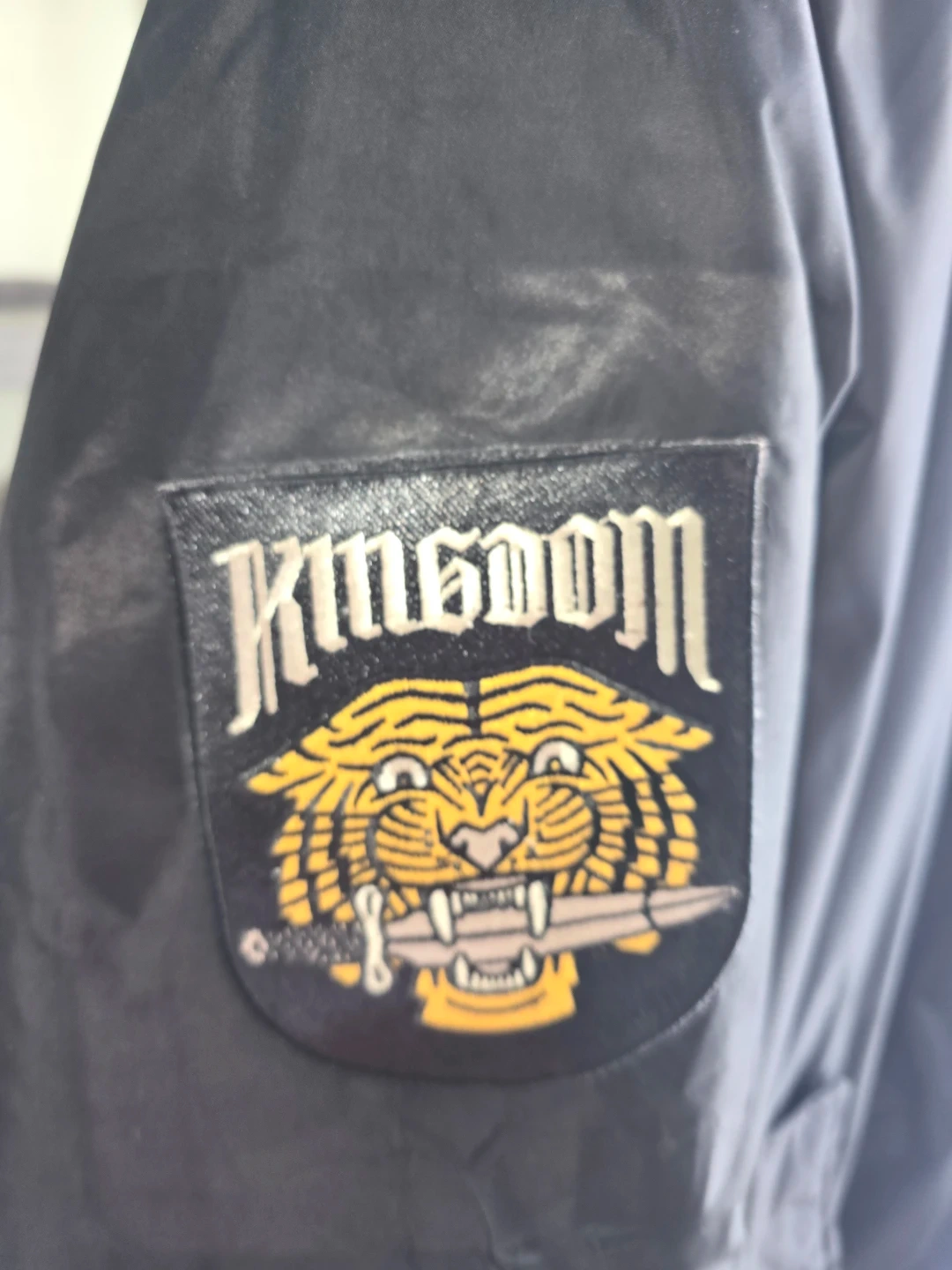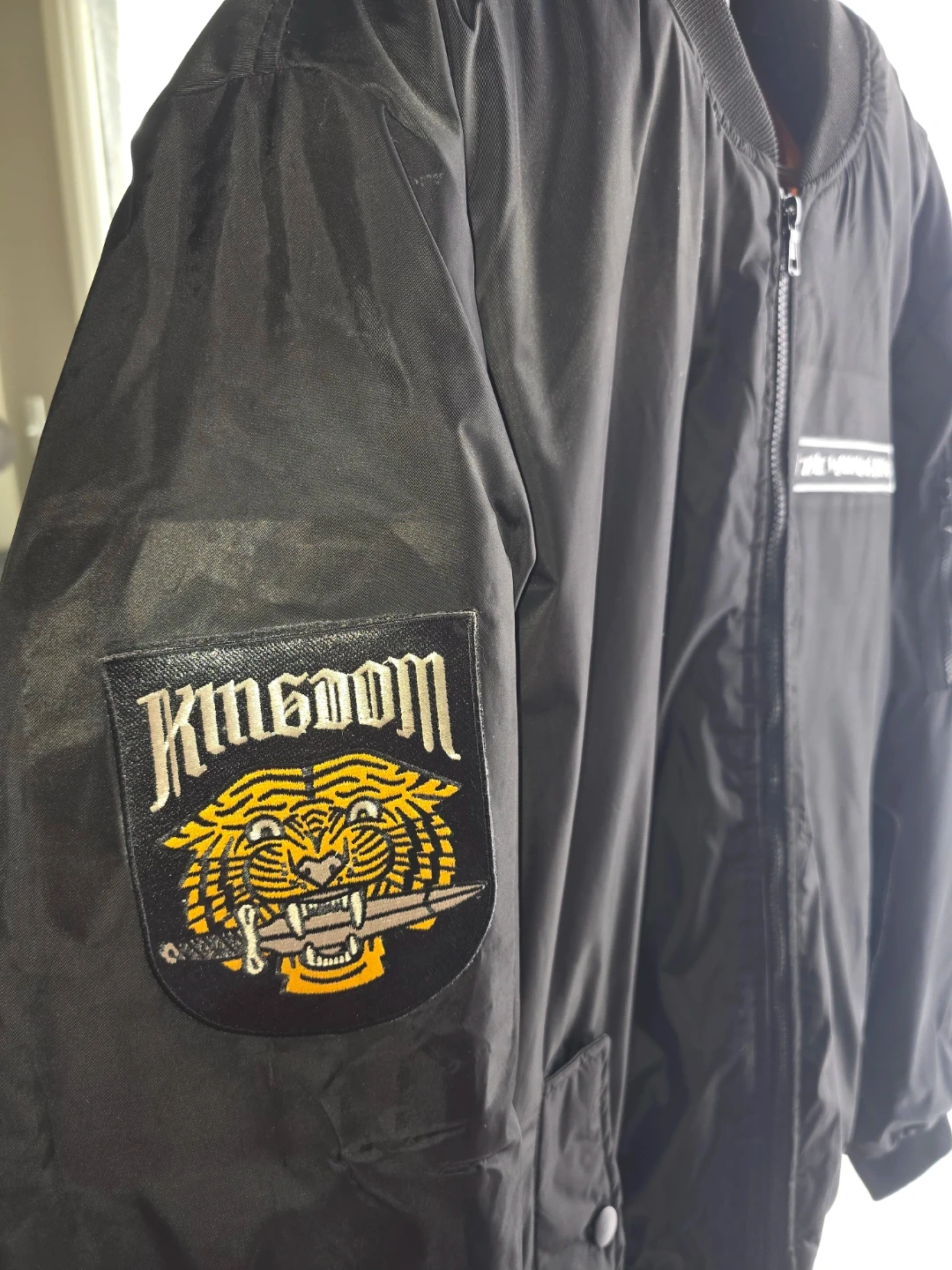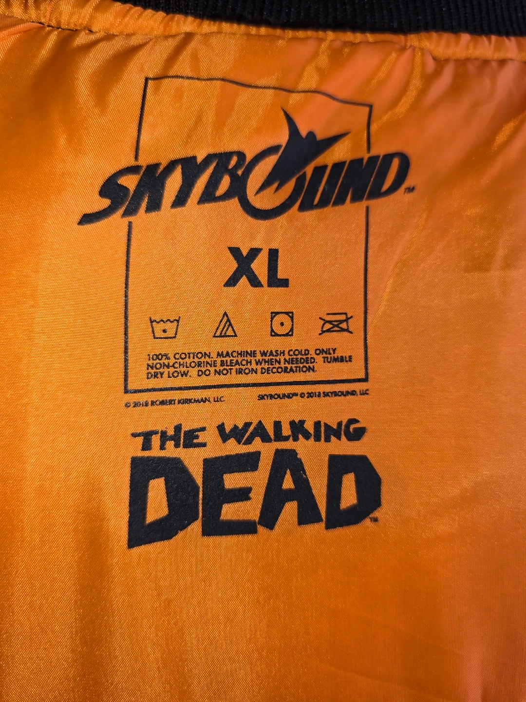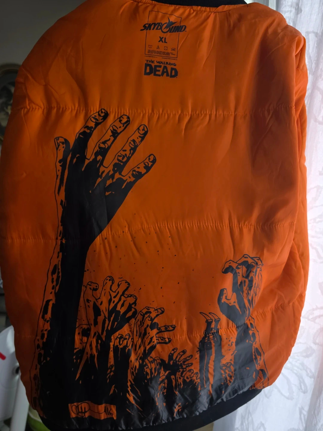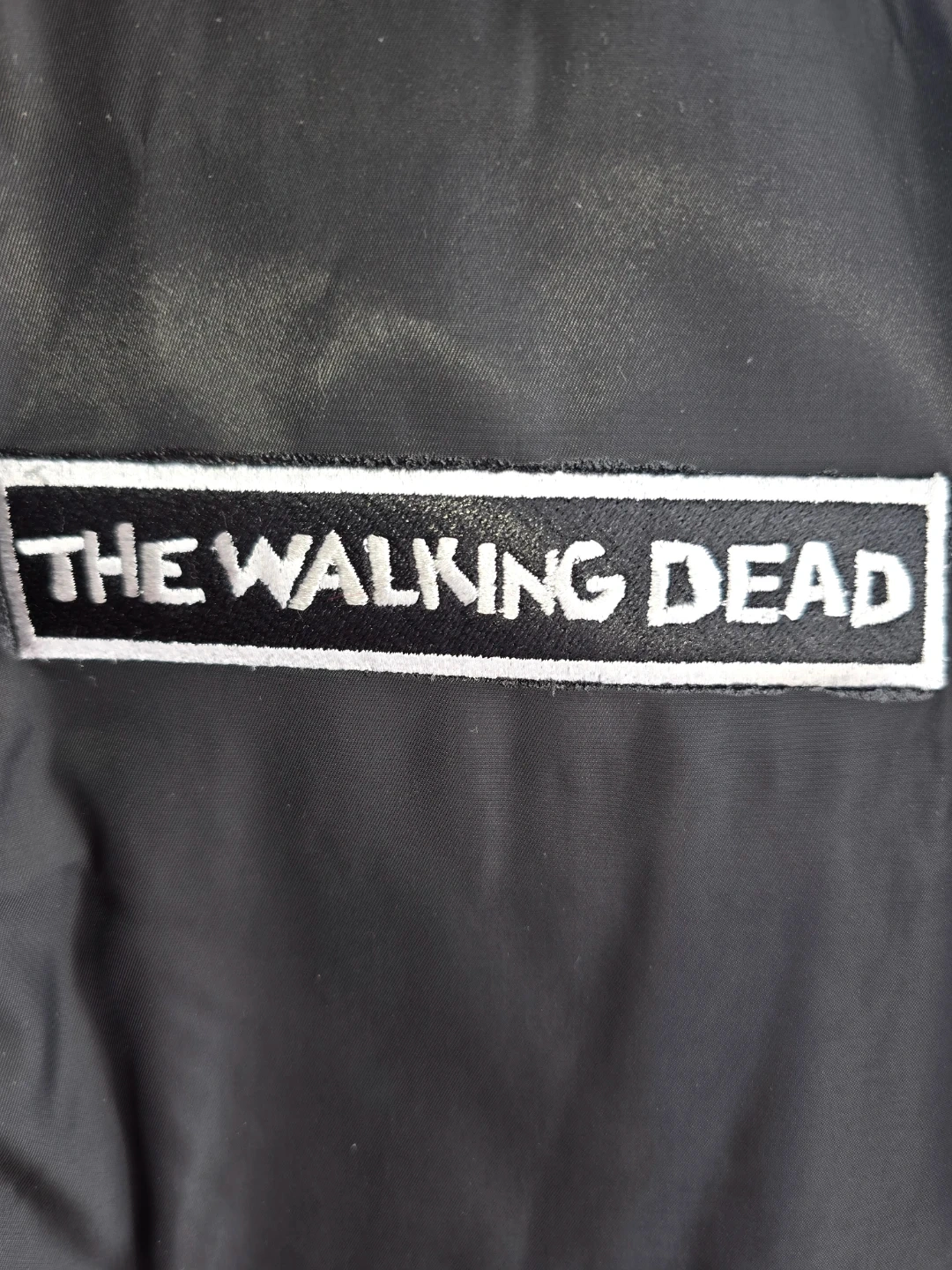 Black bomber jacket with 'The Walking Dead' patch on the chest and a tiger graphic patch on the sleeve. It's a size XL with an orange lining and zombie hand graphic on the back.