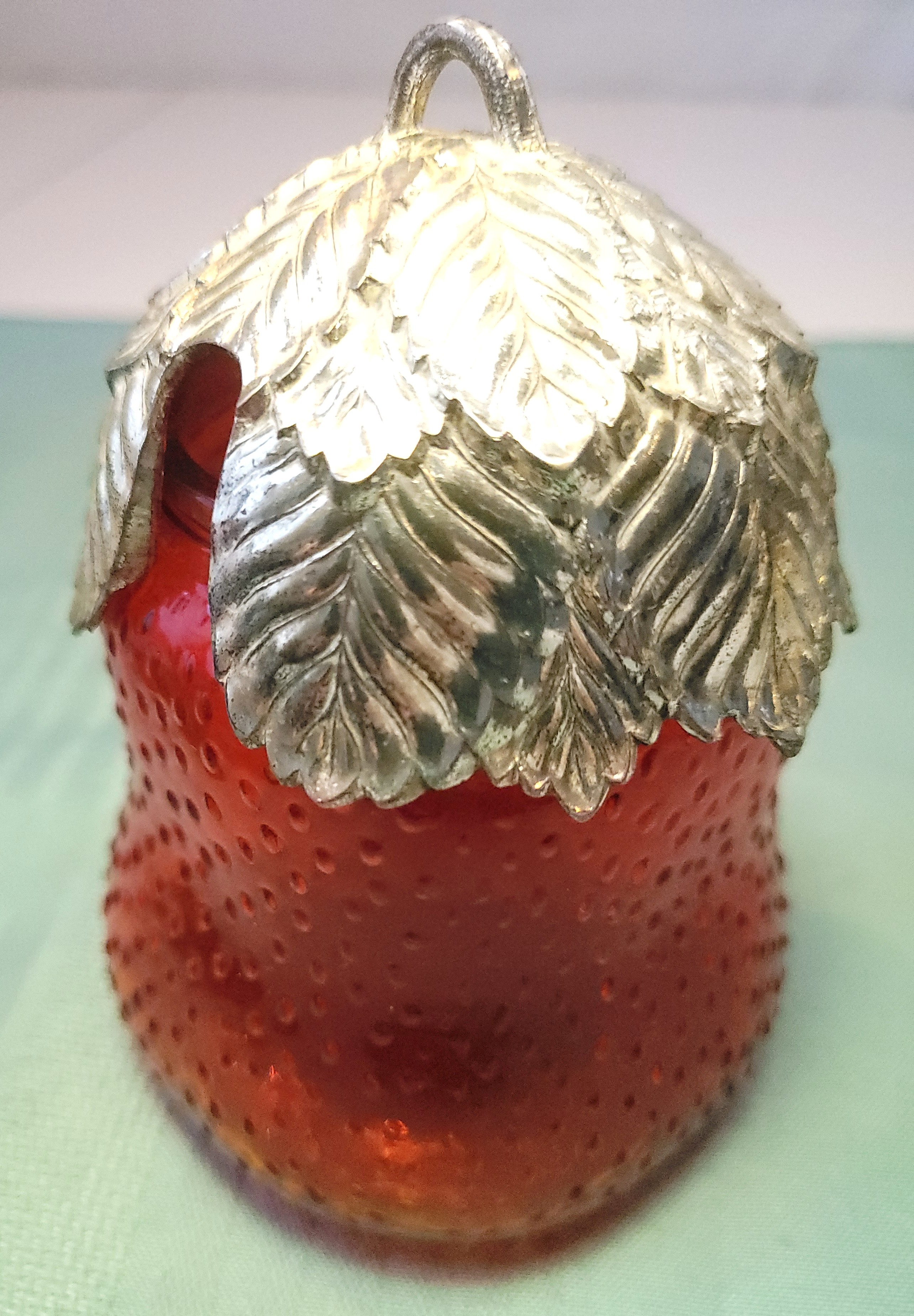 Description: Up for sale is a beautiful mid-century figural strawberry jam jar. This is the highly collectible ruby glass version, featuring a vibrant red, "seeded" textured body that catches the light beautifully. It is topped with a heavy, silver-toned metal lid designed as a cluster of strawberry leaves with a stem handle.