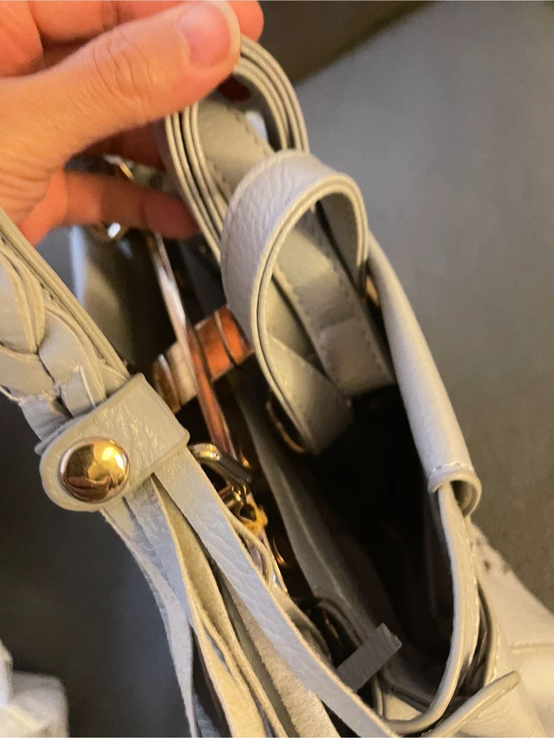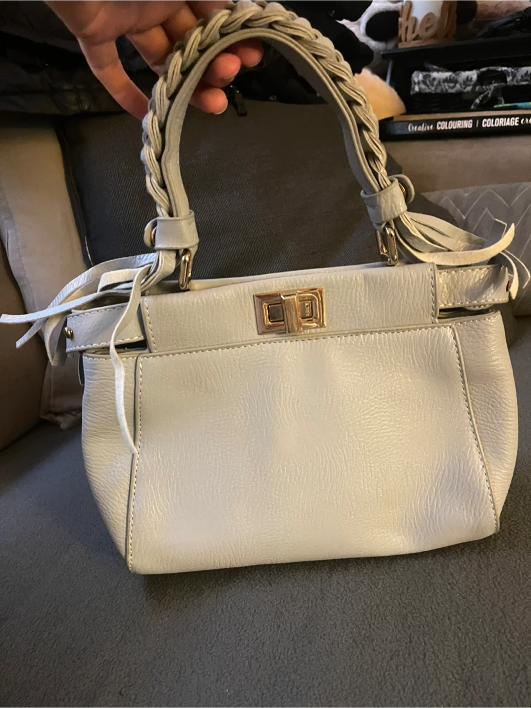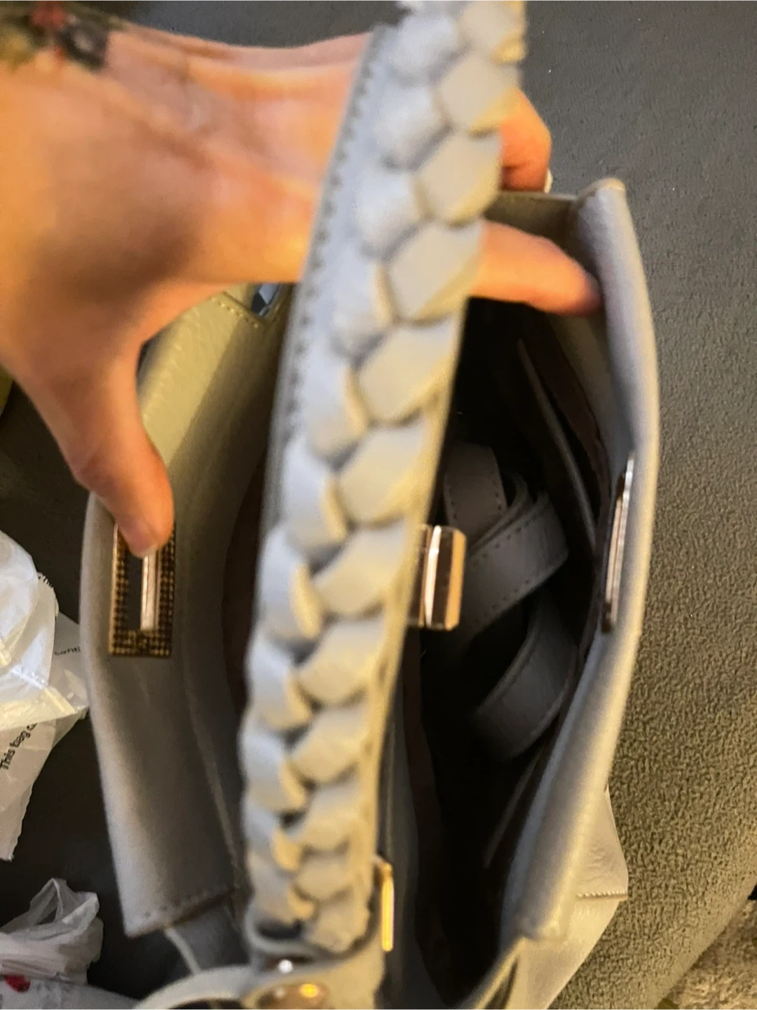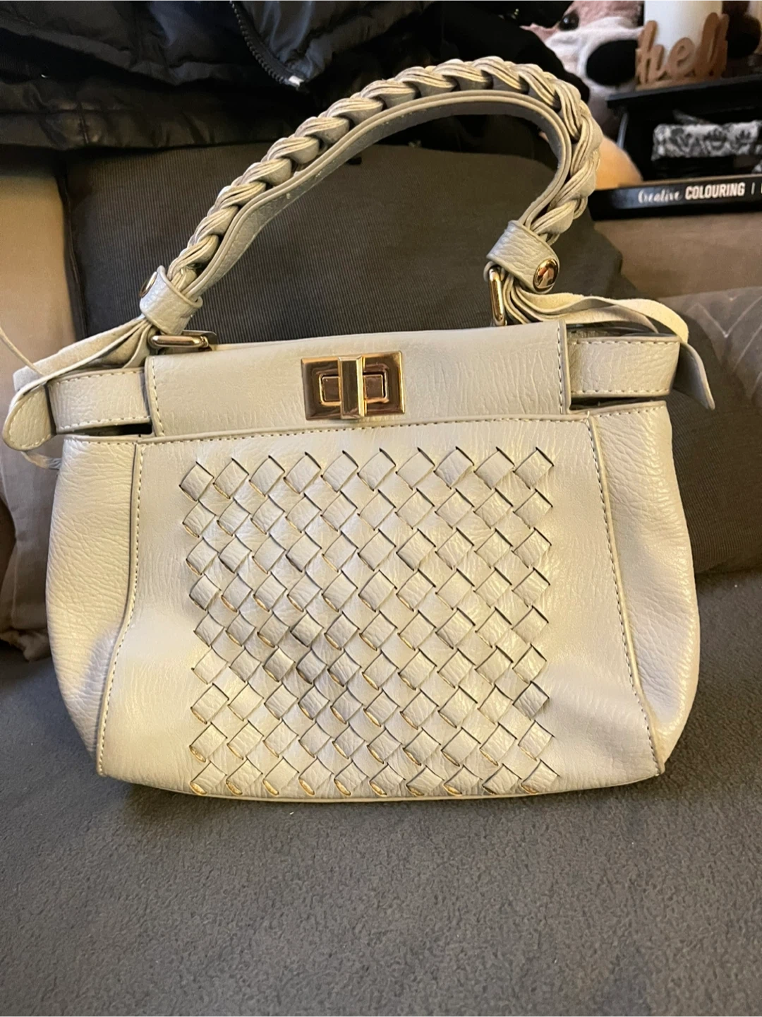 Selling a light blue handbag with a unique braided handle. It's in good condition and has a stylish woven design on the front. The bag also comes with an additional long strap.