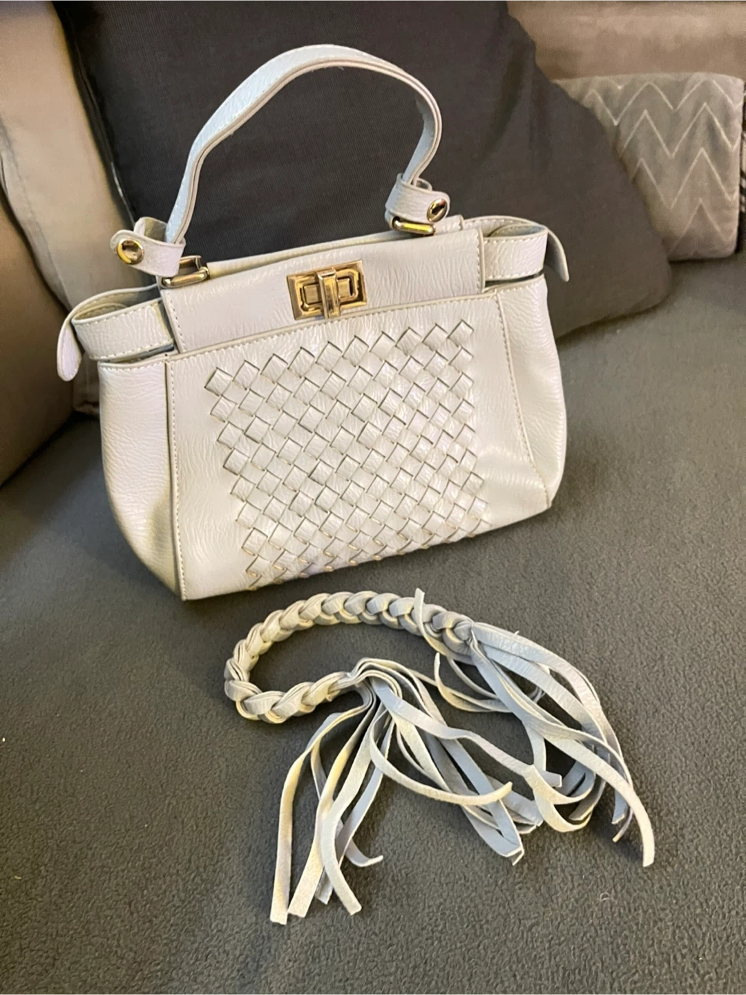 Selling a light blue handbag with a unique braided handle. It's in good condition and has a stylish woven design on the front. The bag also comes with an additional long strap.