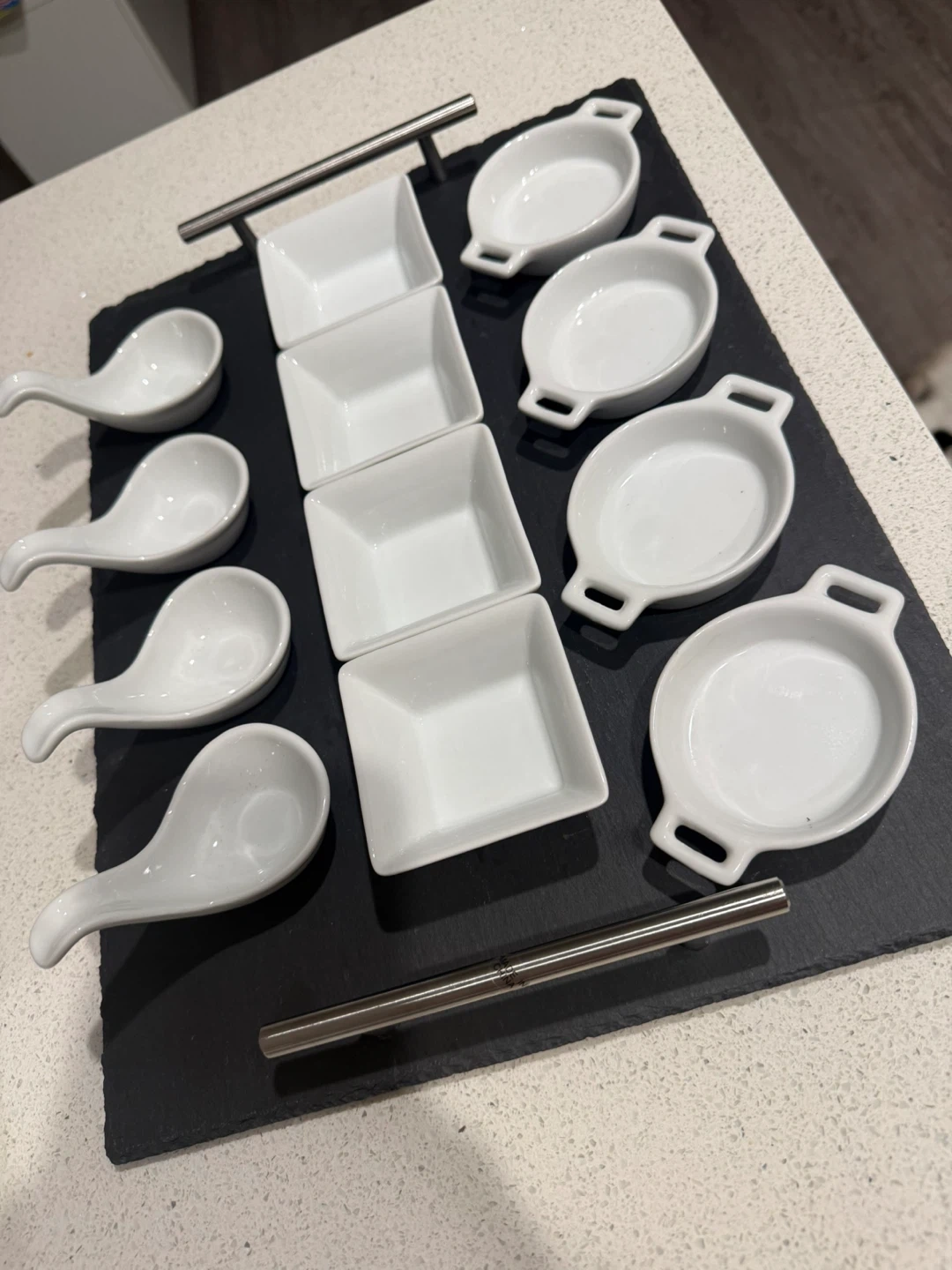 Set of 4 white ceramic ramekins and 4 matching spoons, presented on a black slate serving tray. It includes two types of dishes for serving appetizers or desserts. Slate tray has metal handles.