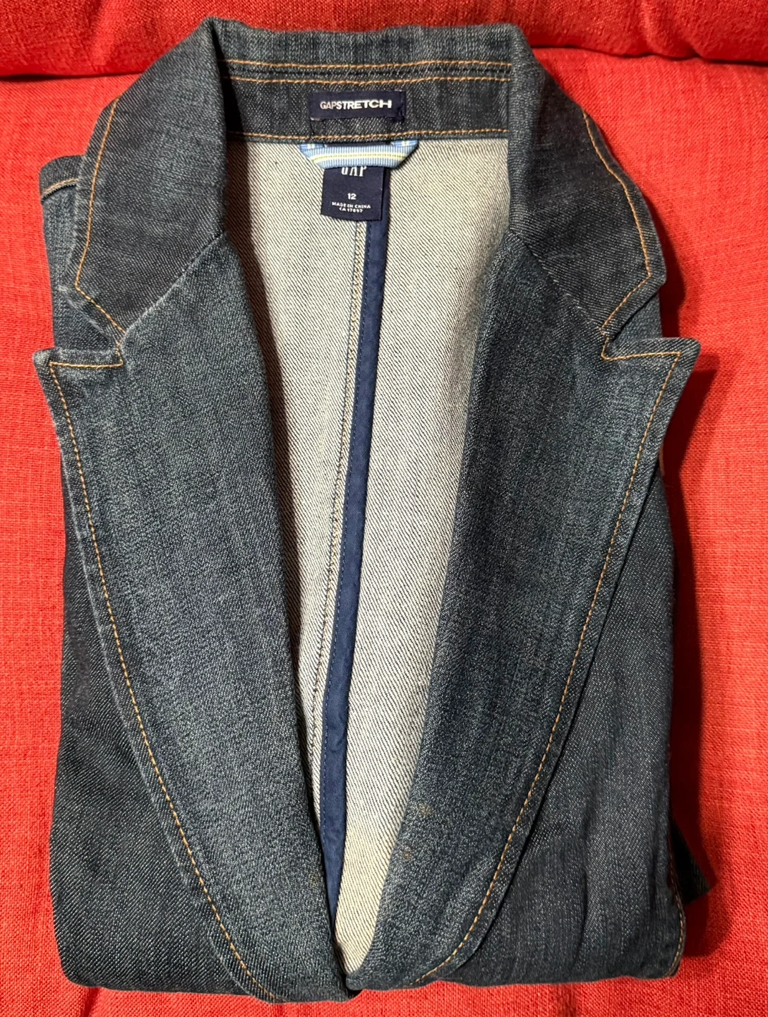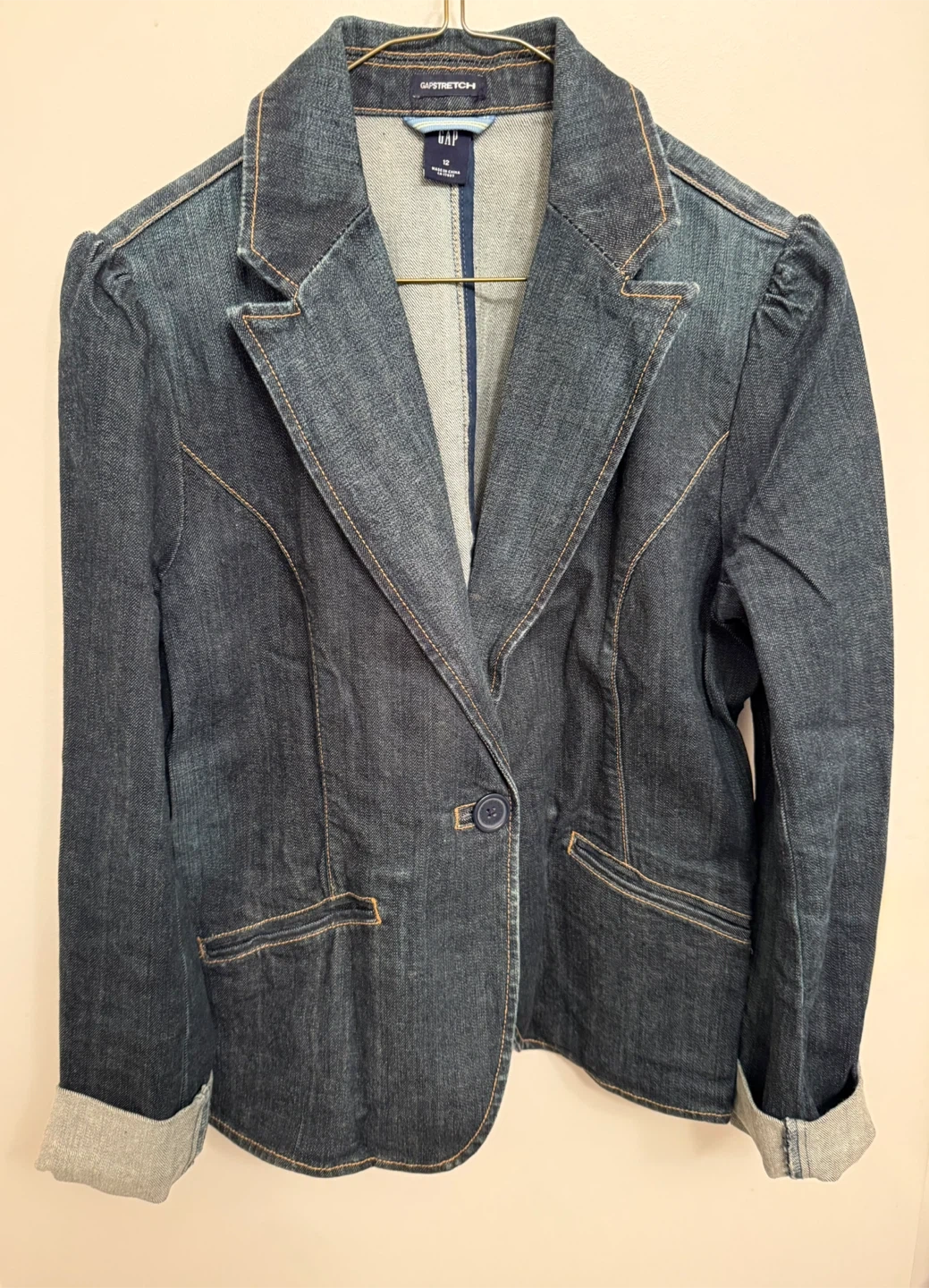 Stylish GAP Stretch denim blazer. It's a dark wash denim with contrast stitching and a single button closure. Features puffed shoulders and cuffed sleeves in a Size 12.