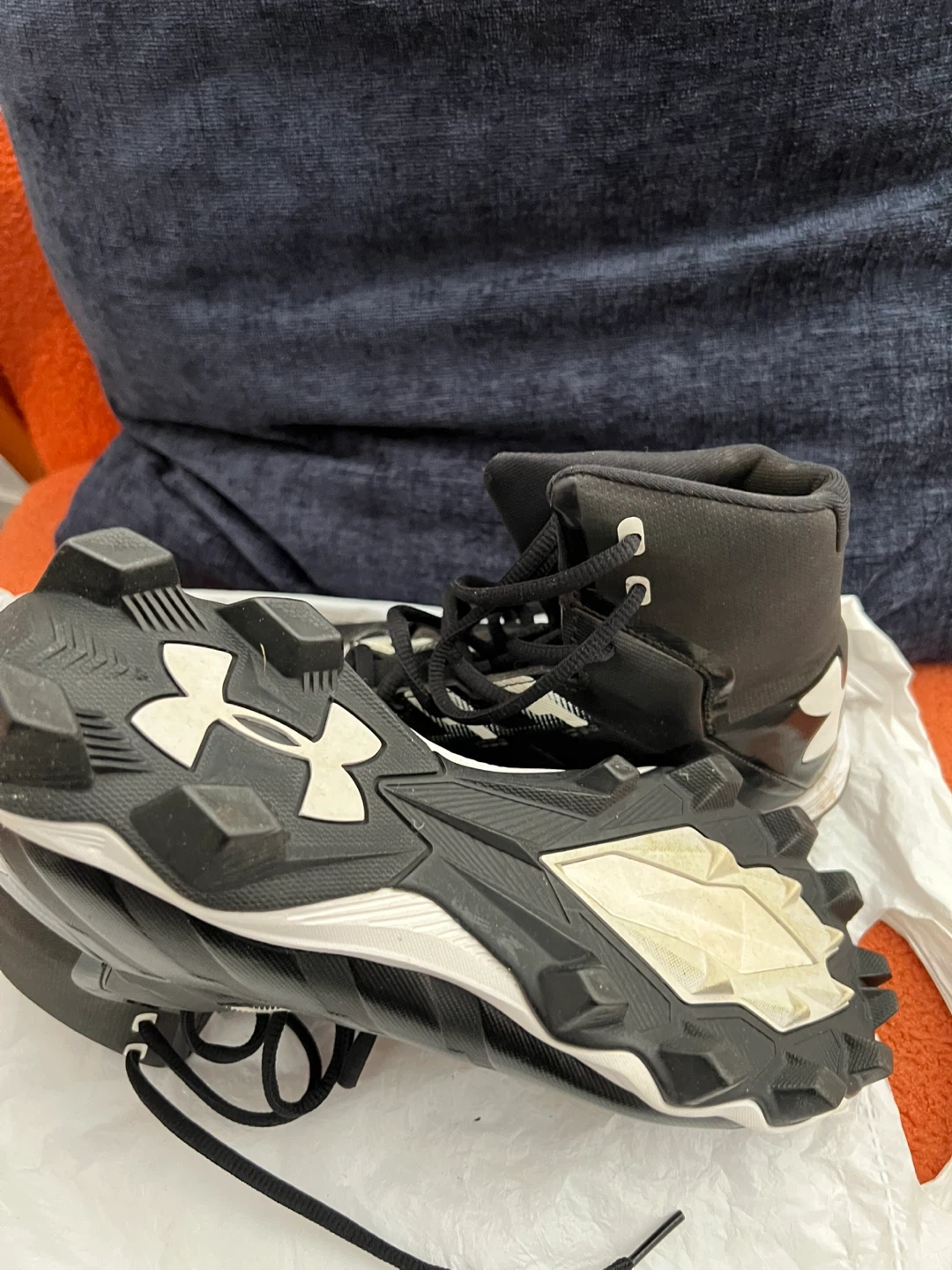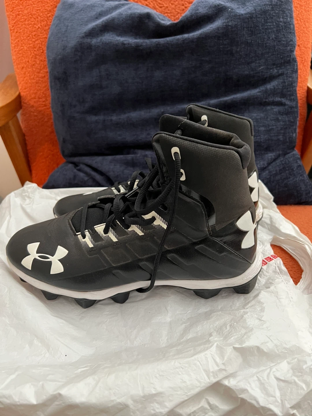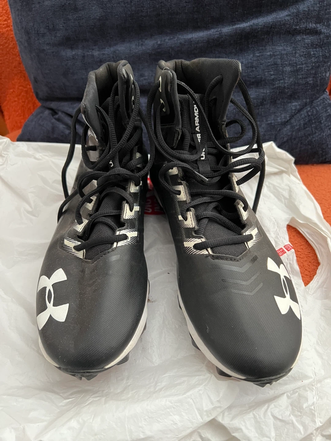 Under Armour black football cleats. Size is 8 US Women’s. They're high-top with laces.