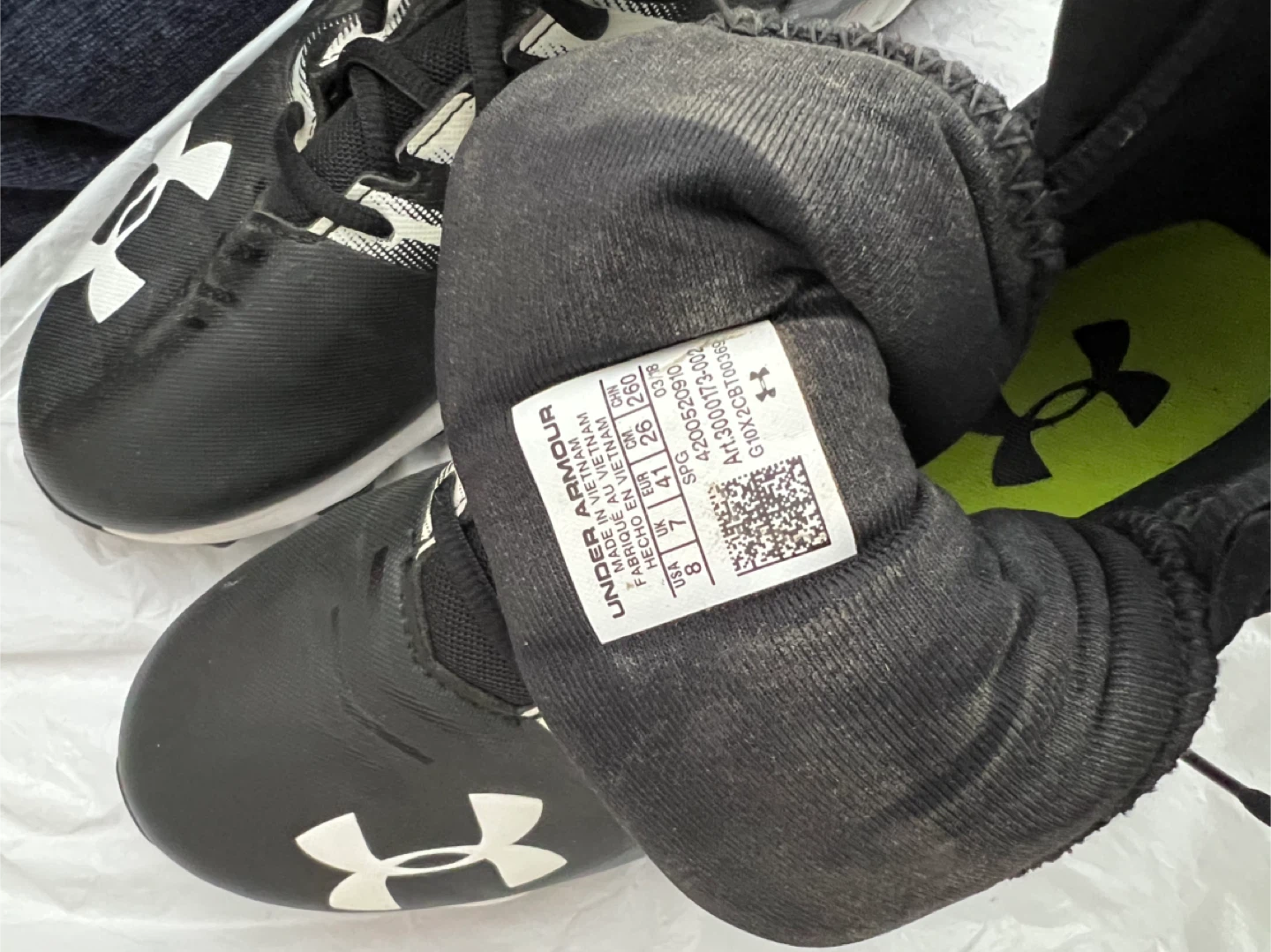 Under Armour black football cleats. Size is 8 US Women’s. They're high-top with laces.