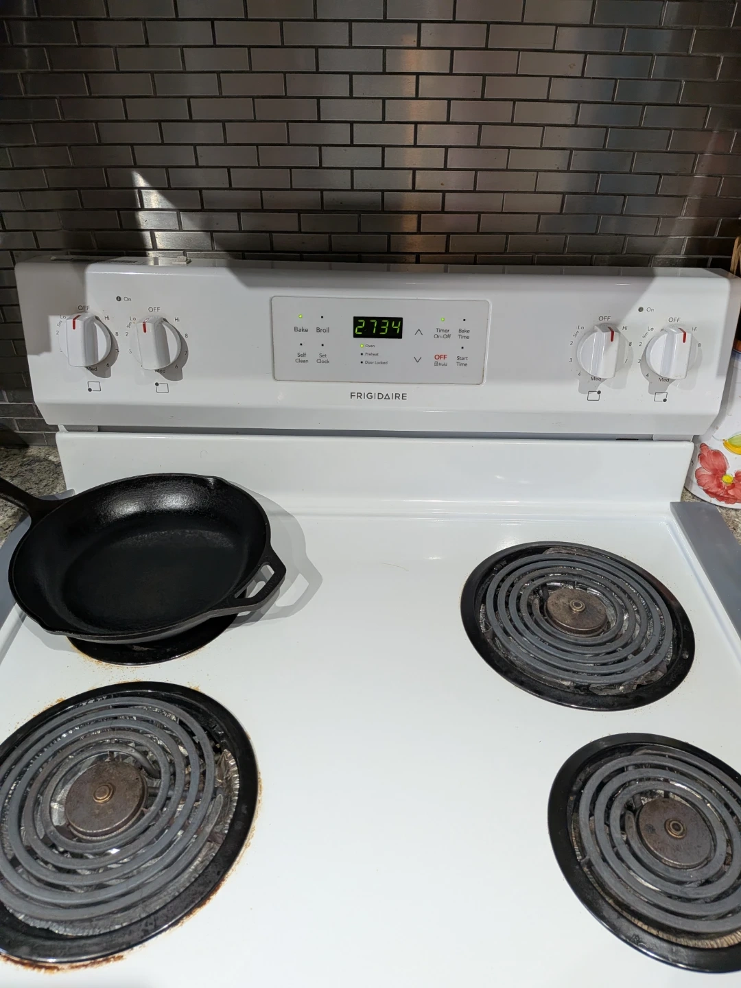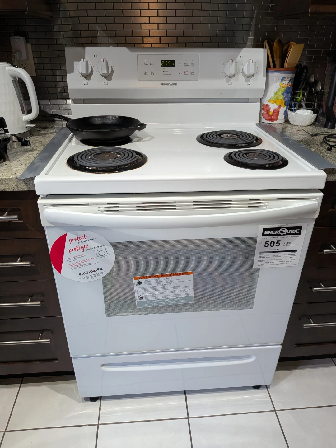 This is a white Frigidaire electric stove. It features four coil burners and an oven with a glass door. The stove is in good condition and ready for use.
