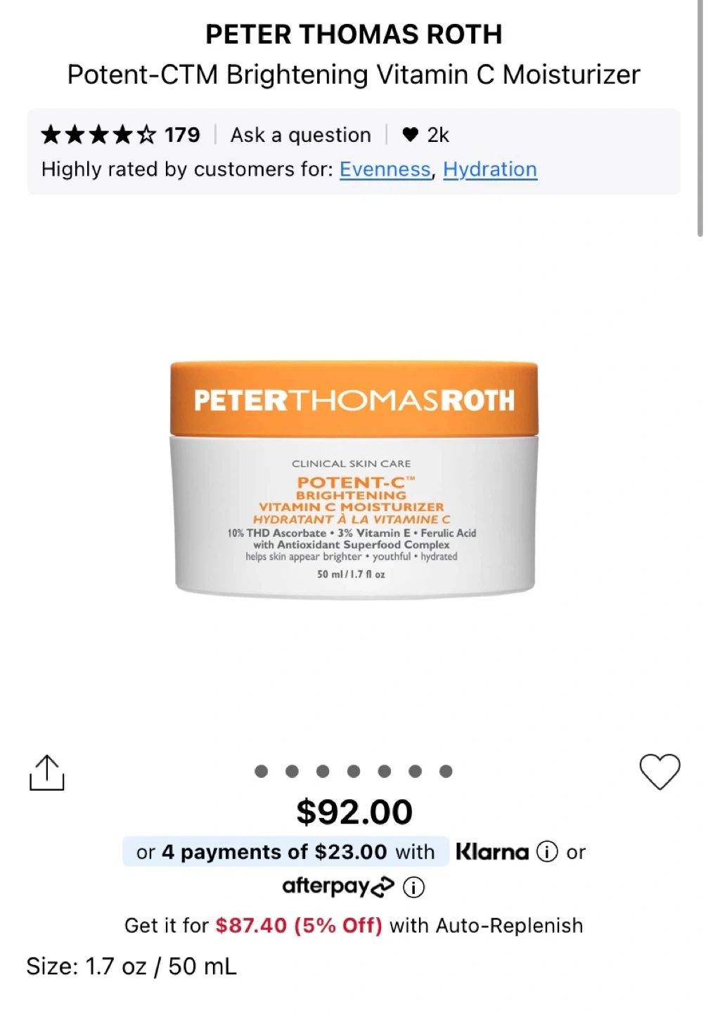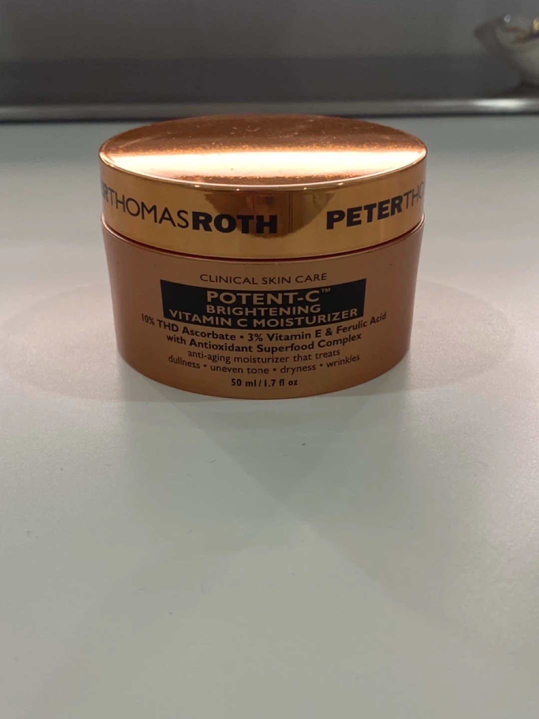 I'm selling a Peter Thomas Roth Potent-C Brightening Vitamin C Moisturizer! It's a clinical skin care product that contains 10% THD Ascorbate, 3% Vitamin E & Ferulic Acid with Antioxidant Superfood Complex. It helps treat dullness, uneven texture, dryness, and wrinkles. The size is 50 ml / 1.7 fl oz. Retails for $92!