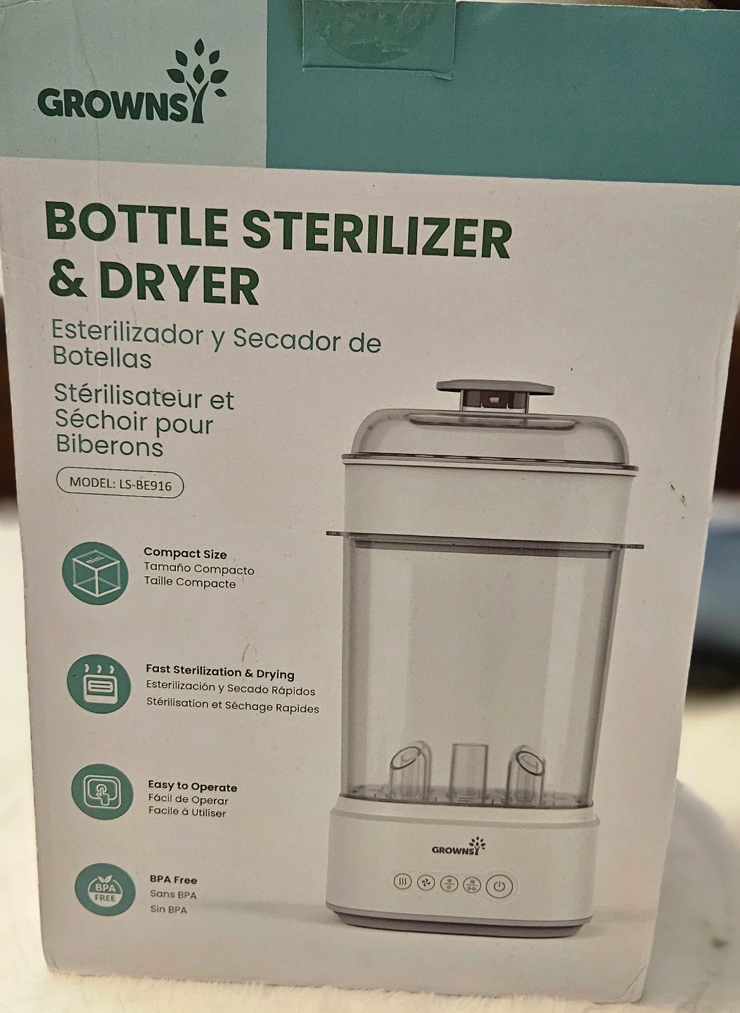This is a Grownsy 5-in-1 baby bottle sterilizer and dryer. It offers sterilizing, drying, auto, fast auto, and storage functions. It's COMPACT and easy to operate, making it handy for keeping baby's feeding items clean. BPA free construction ensures safety.