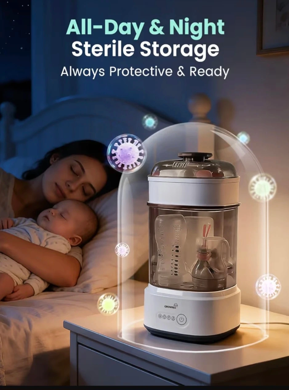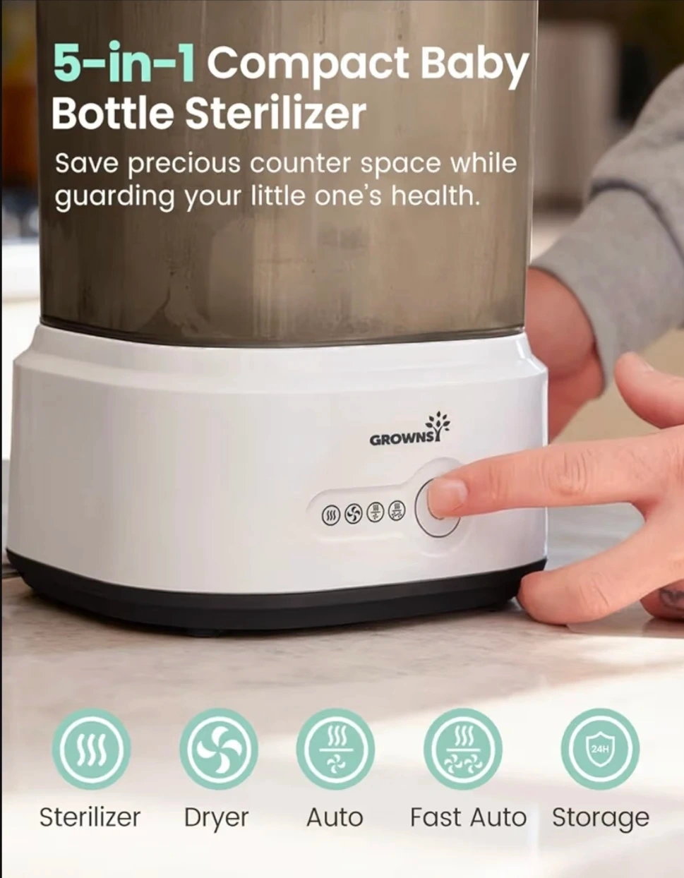 This is a Grownsy 5-in-1 baby bottle sterilizer and dryer. It offers sterilizing, drying, auto, fast auto, and storage functions. It's COMPACT and easy to operate, making it handy for keeping baby's feeding items clean. BPA free construction ensures safety.