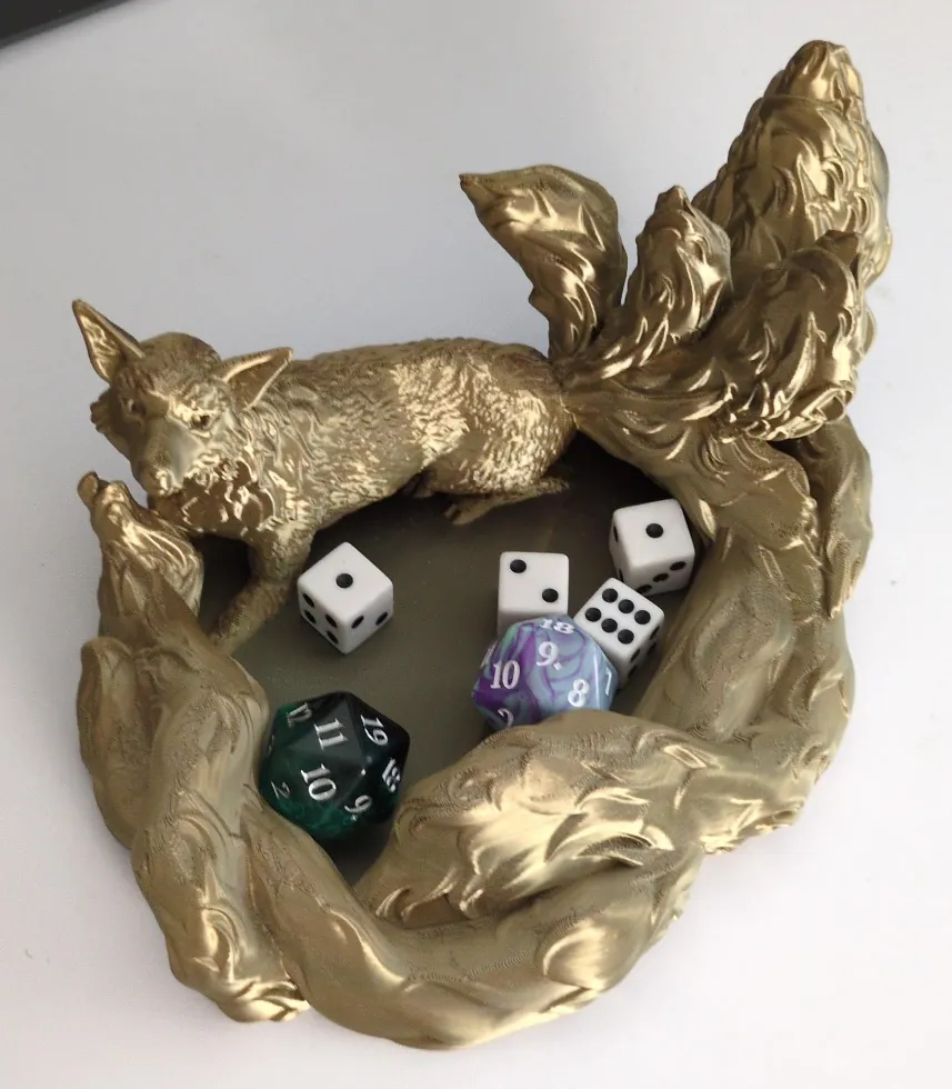 A unique golden fox dice holder! Perfect for Dungeons and Dragons or any tabletop game enthusiast. It's in great shape and ready to hold your favourite dice! (Dice not included)