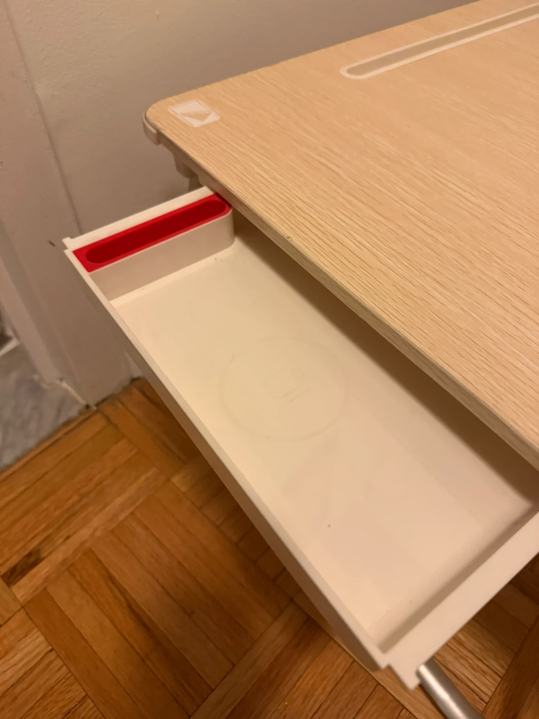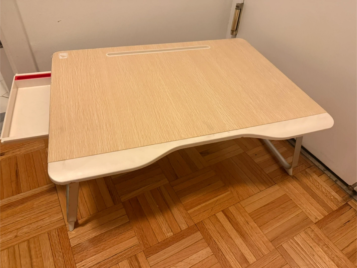 This portable lap desk has a wood-grain finish and a built-in drawer for storage. It folds flat for easy carrying and storage. It's great for use in bed or on the couch!