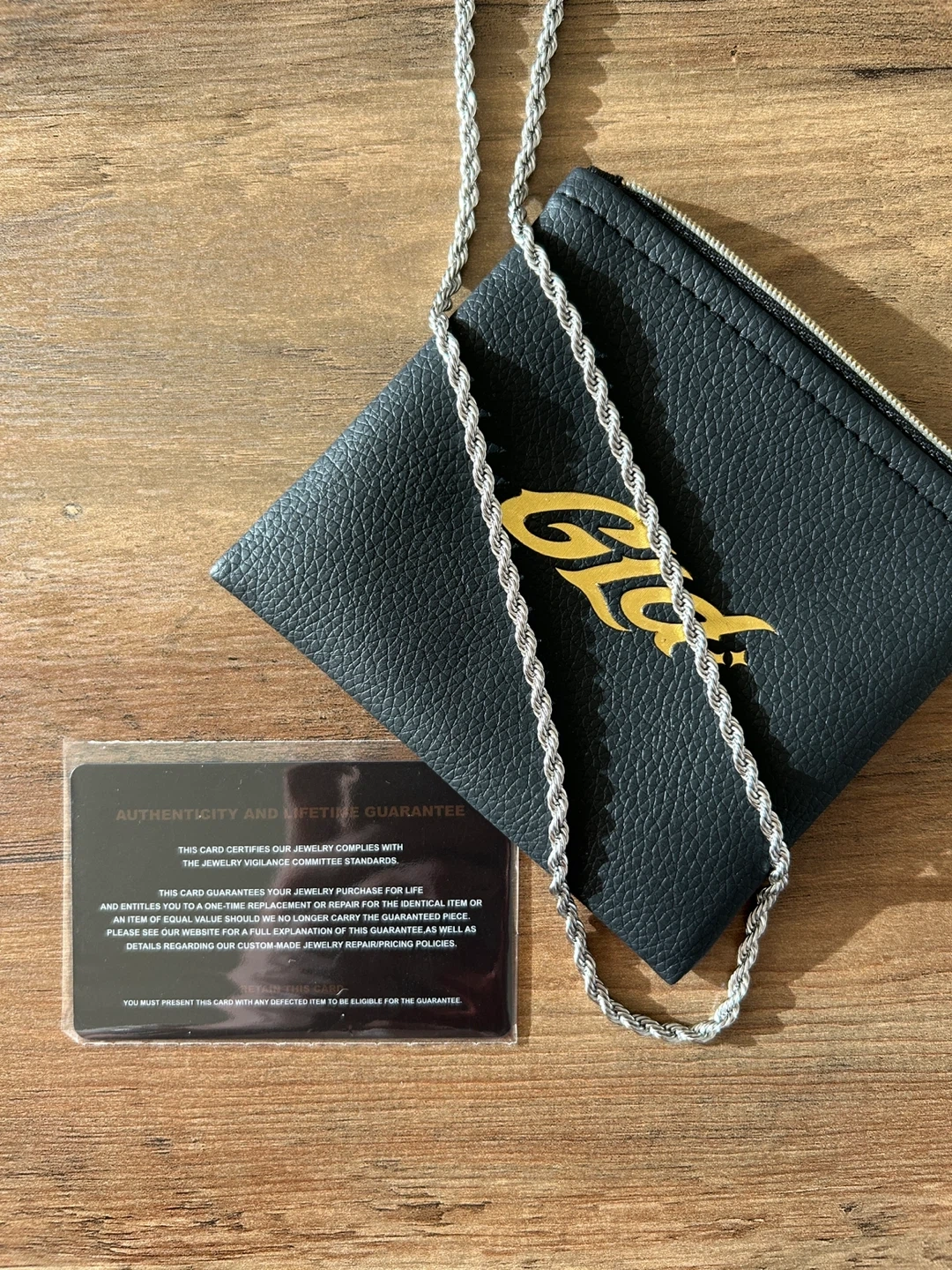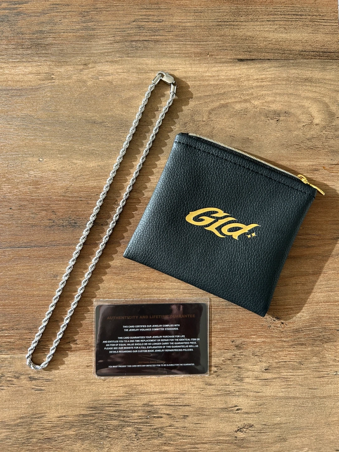 This is a GLD white gold rope chain necklace in brand new condition, never worn. It comes with the authenticity card/lifetime warrantee and the original pouch. Originally purchased for $183 + tax, shipping & duties