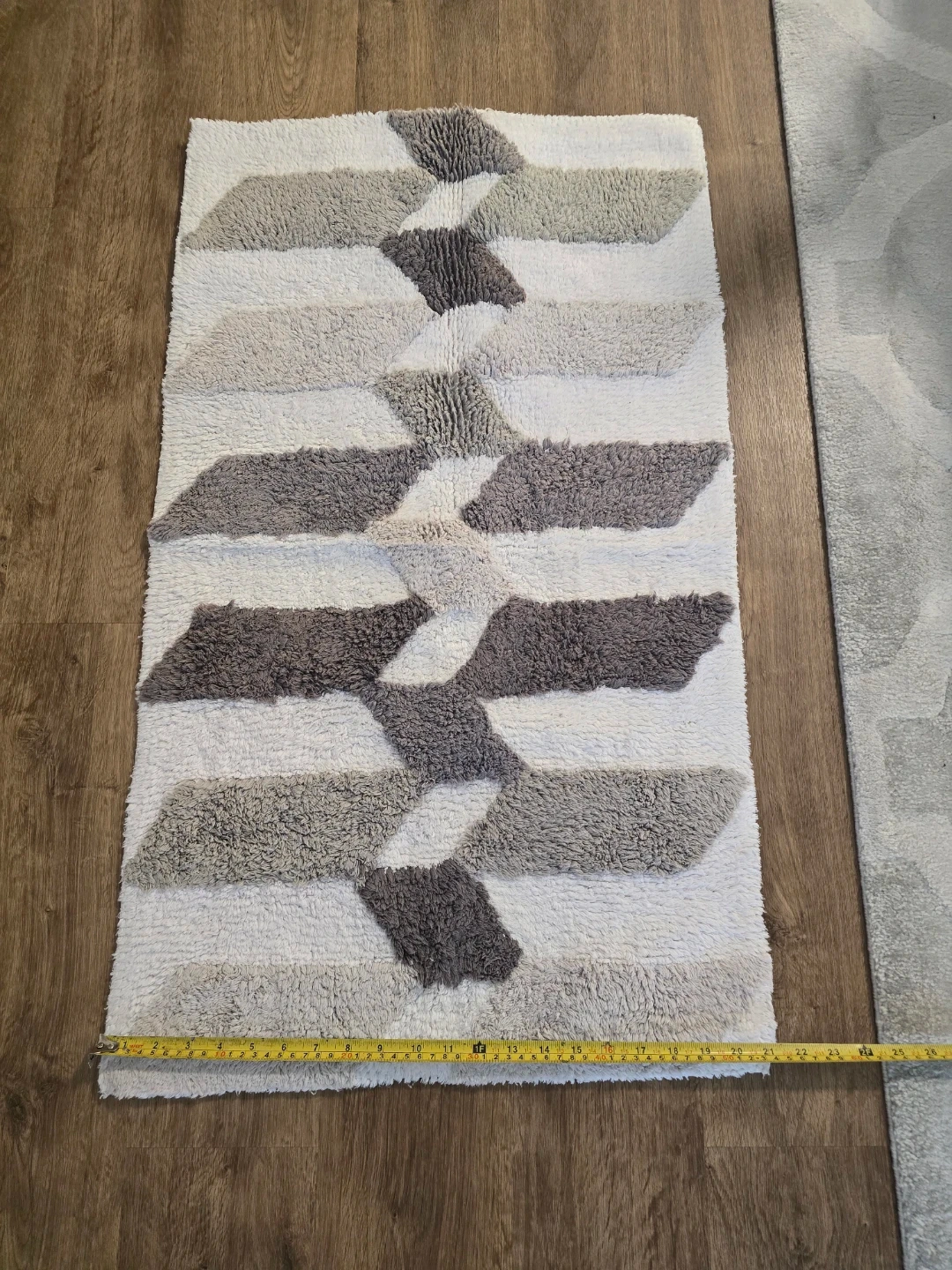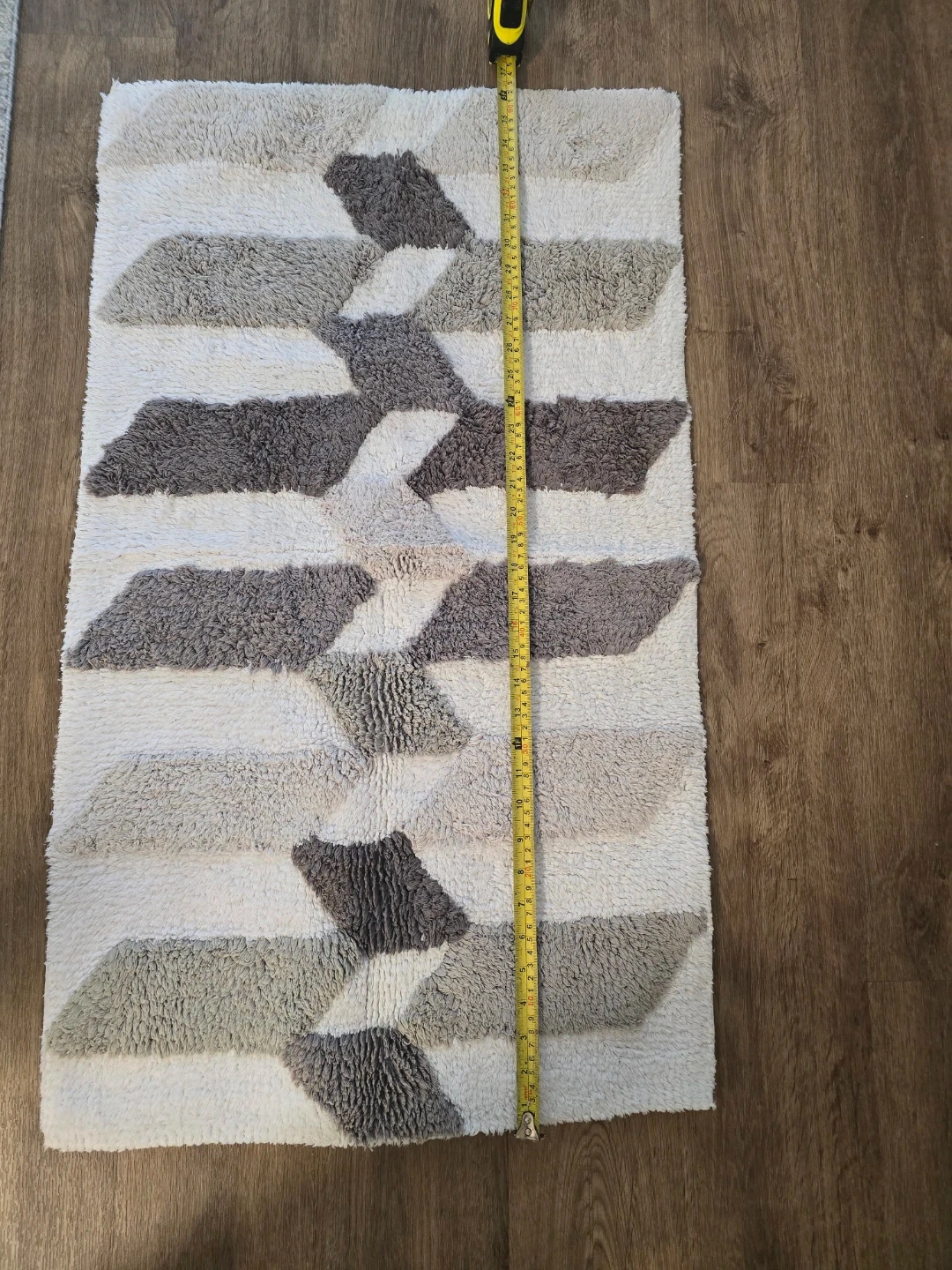 This Caro Home bath mat runner features a modern geometric pattern in white, grey, and beige. It's made from a soft, textured material. Measurements are approximately 20 inches wide by 34 inches long.
