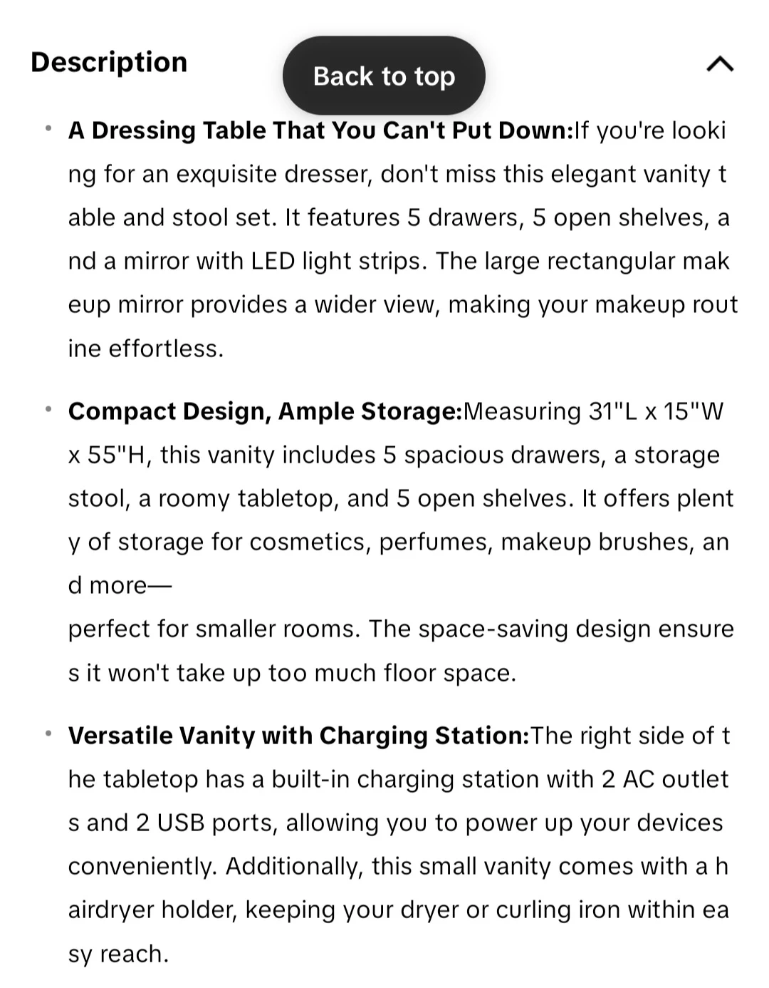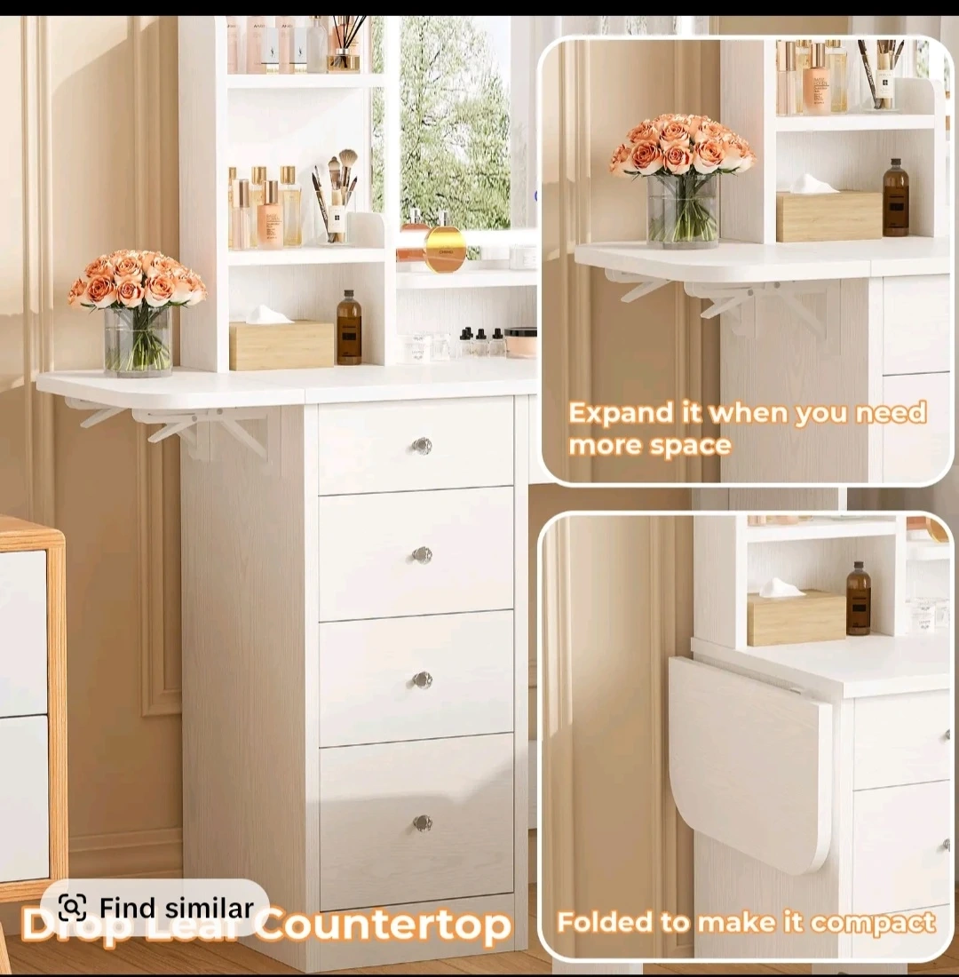 New in a box sealed white vanity dressing table set features 5 drawers, 5 open shelves, and a large mirror with LED light strips. It includes a matching stool and a drop-leaf countertop for adjustable space. The vanity also has a built-in charging station with 2 AC outlets and 2 USB ports. Total dimensions are 31"L x 15"W x 55"H.