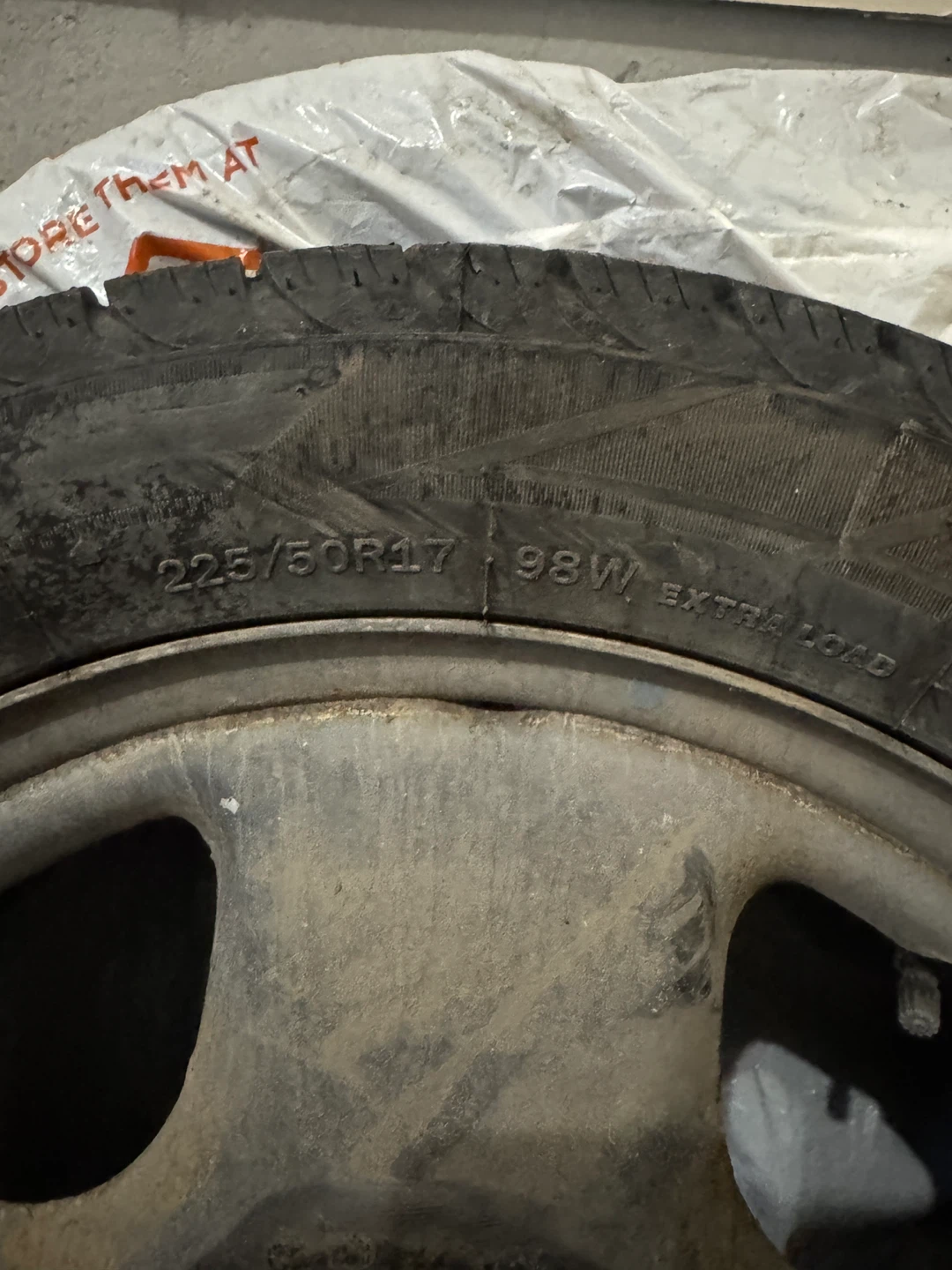 Two tires with rims included. Tire size is 225/50R17 98W. These are suitable for all season. Ready for your vehicle! Just one rim had little dent in it and about 80% tires life left