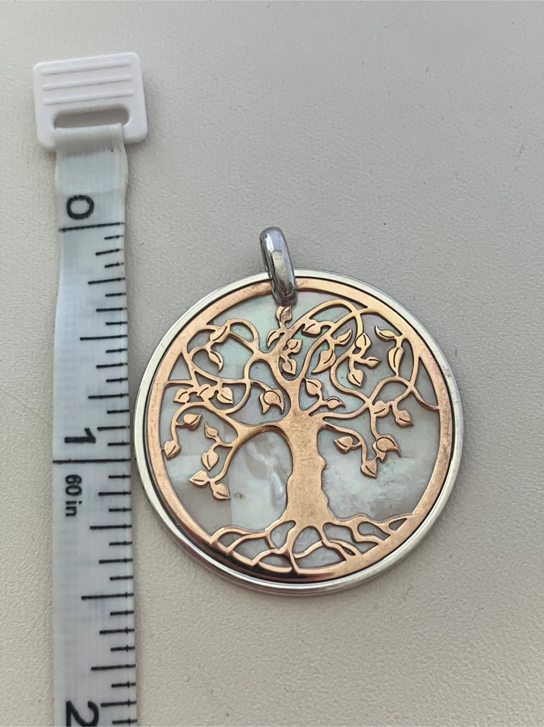 Silver-tone pendant with a mother of pearl inlay and rose gold-tone tree of life design. Measures approximately 1.5 inches in diameter. This pendant would be a lovely addition to any jewelry collection.