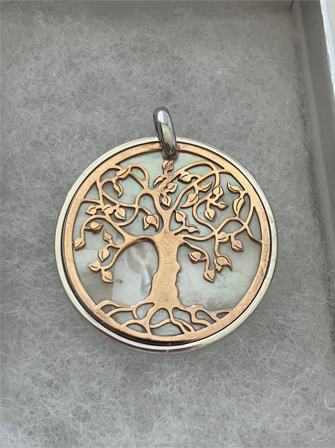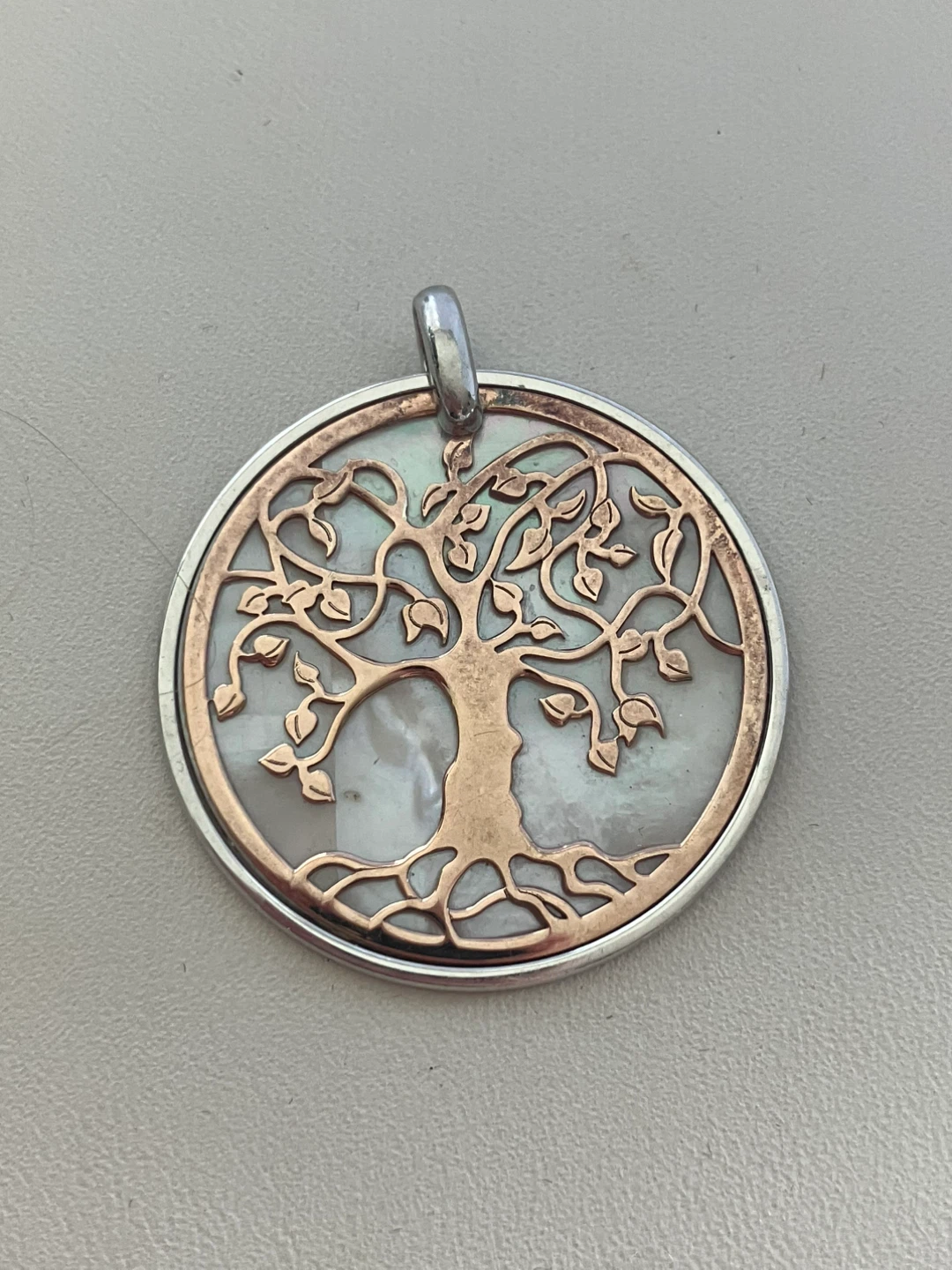Silver-tone pendant with a mother of pearl inlay and rose gold-tone tree of life design. Measures approximately 1.5 inches in diameter. This pendant would be a lovely addition to any jewelry collection.