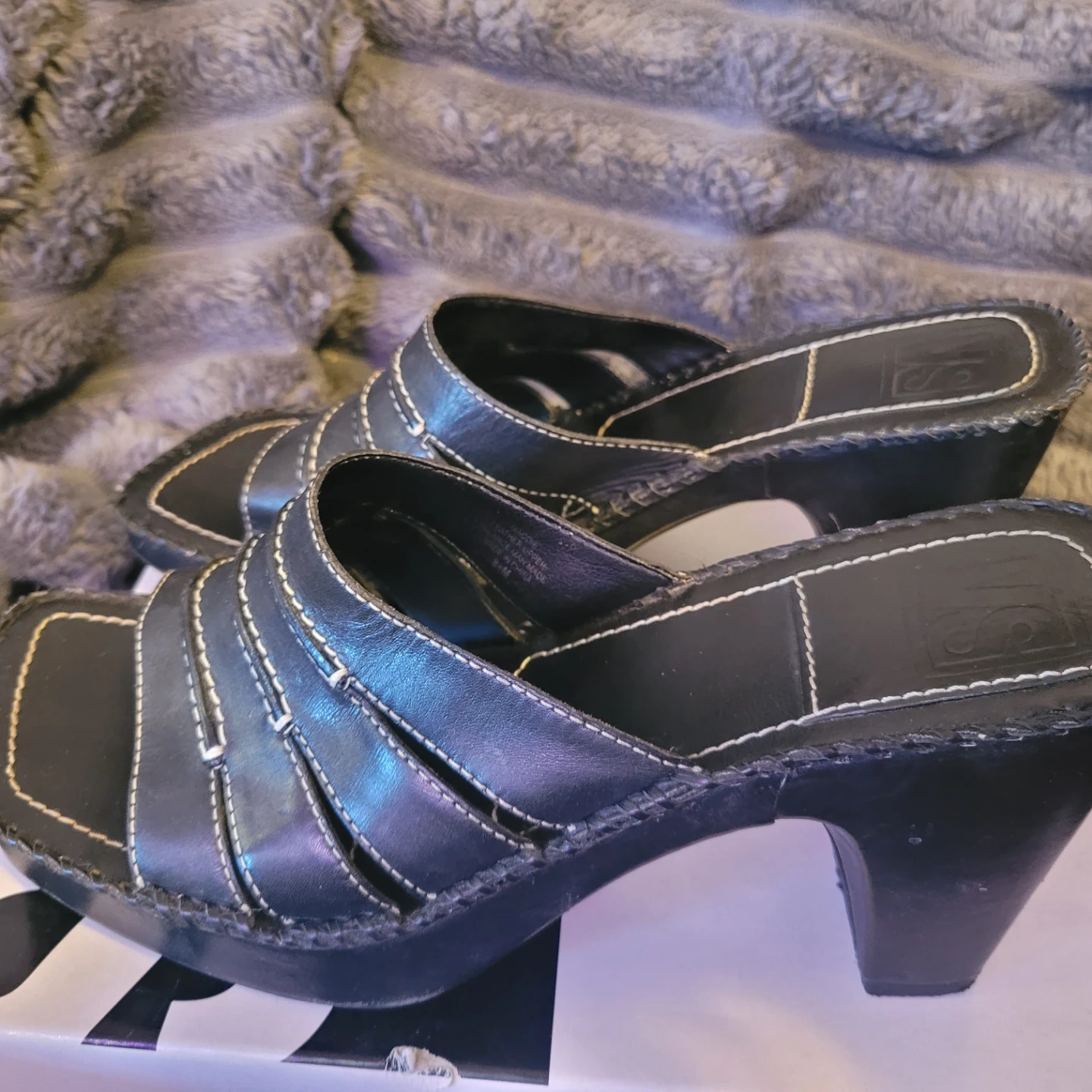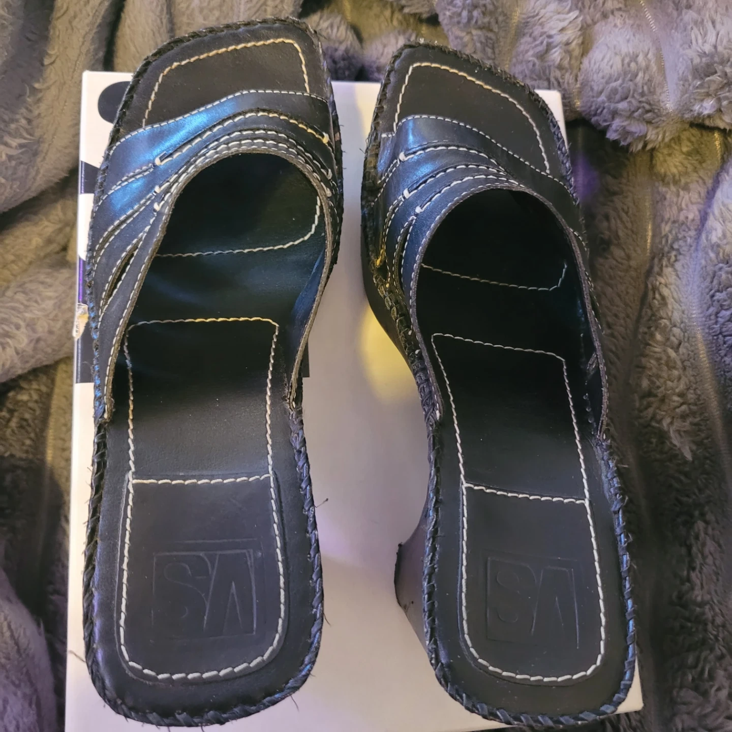 VS MADDIE-S black mules with white stitching detail. Heel height is approximately 3 inches. These are size 8.5 and made of leather. Slip-on style for easy wear!