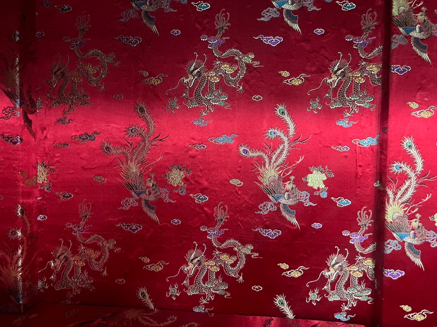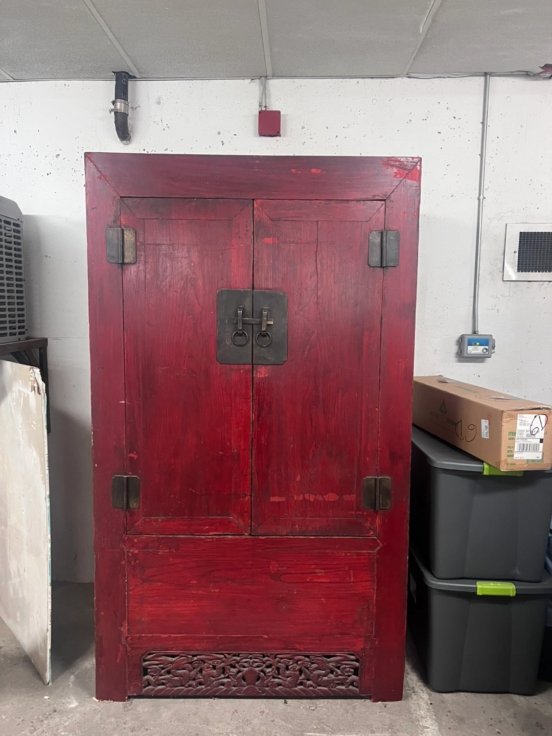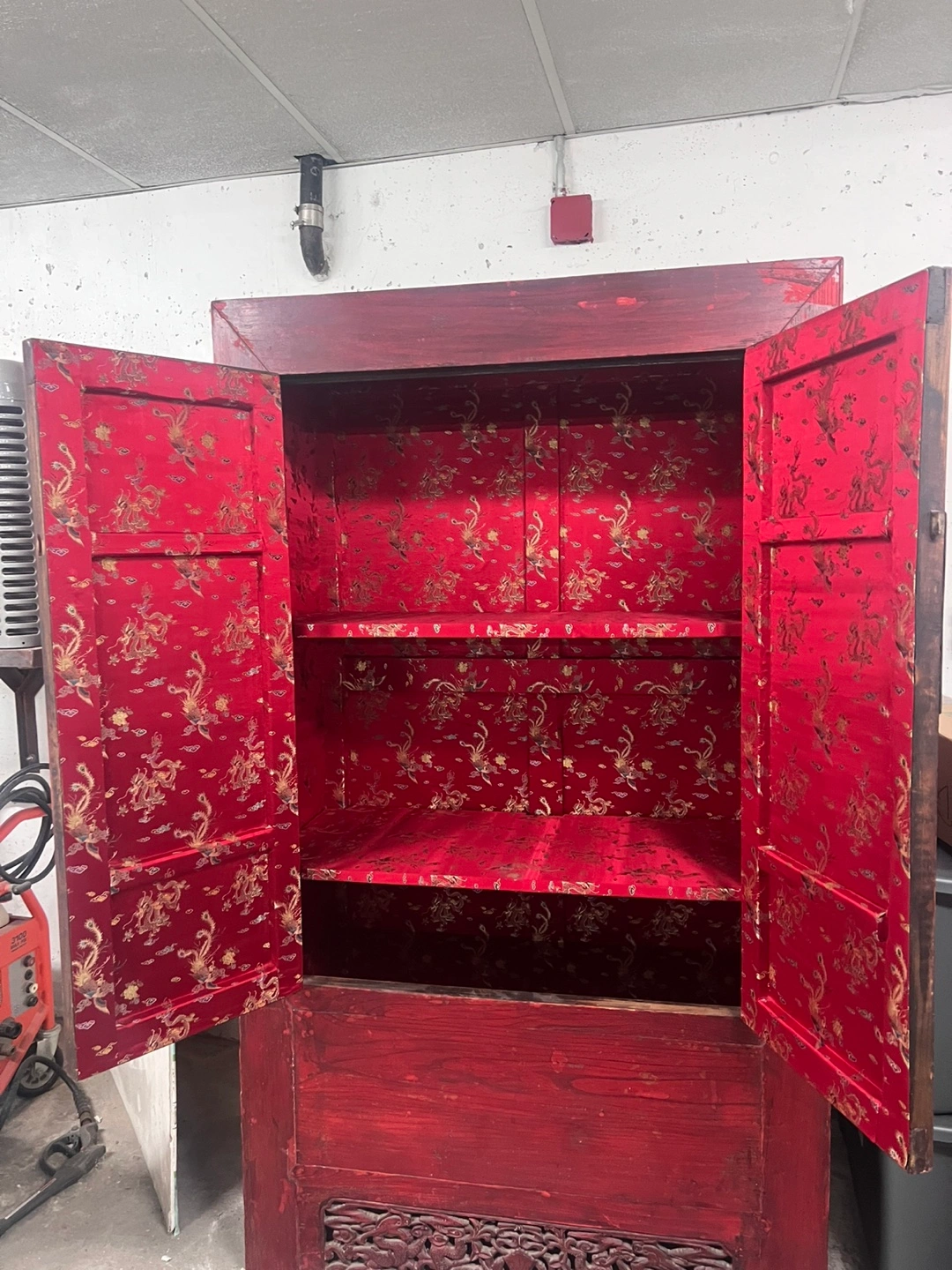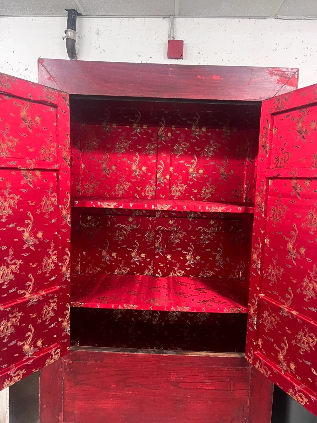 Vintage Chinese cabinet. Red lacquered exterior. Interior lined with red silk featuring gold dragons. Two doors with antique hardware. Features carved details at the base. Great for storage or display.