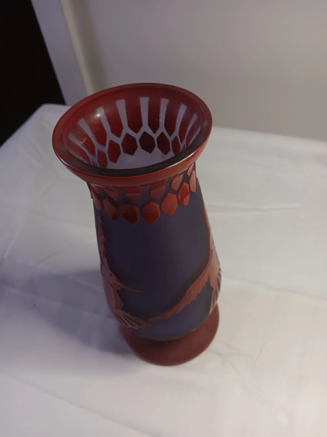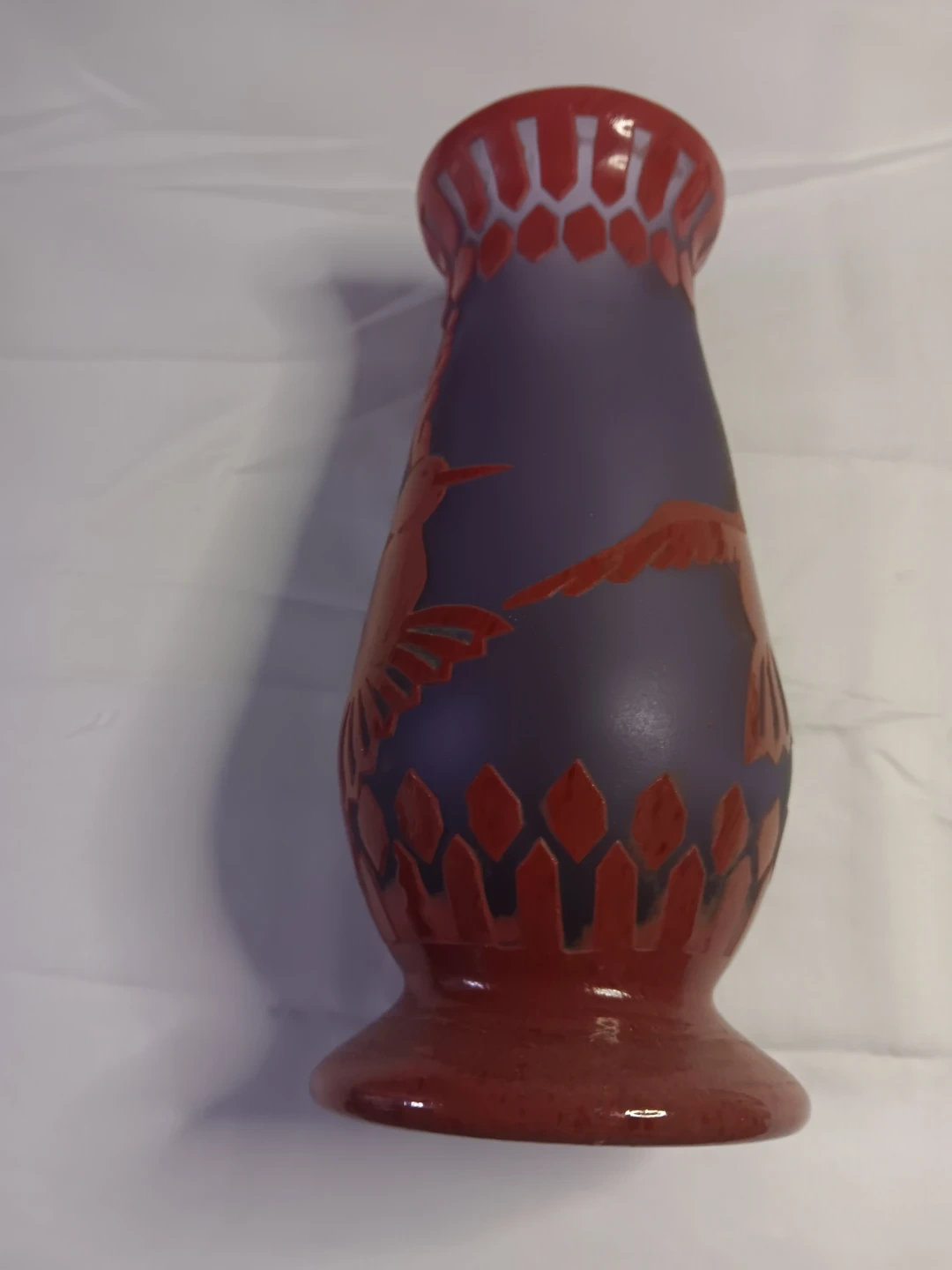A decorative vase featuring a hummingbird design. It has a matte purple body with a frosted texture and red accents around the rim and base. The body of the vase showcases etched or painted hummingbirds in flight.