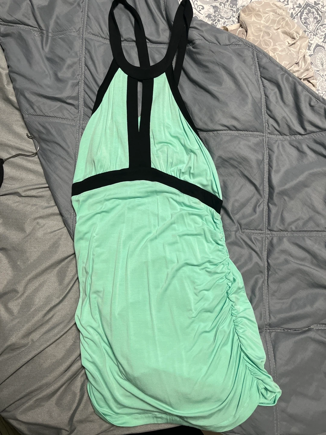 Boston proper mint green halter top with black trim detail. It features ruched sides for a flattering fit. This top is perfect for a casual outing or a night out!