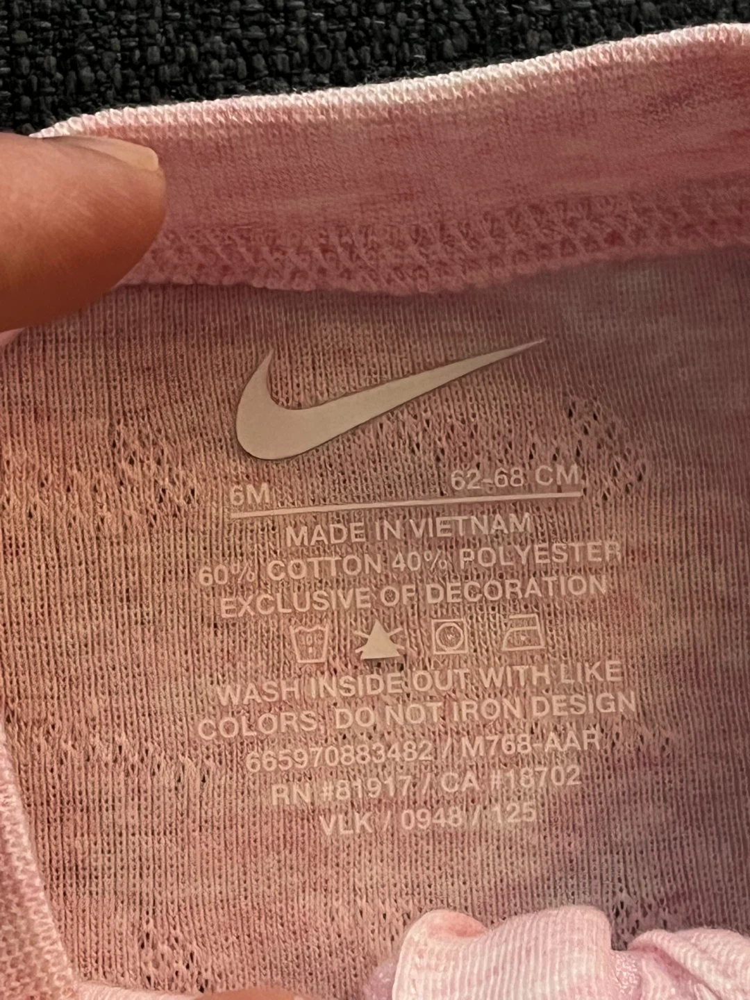 A cute and comfy baby sleeper from Nike! This sleeper is a soft pink colour and size 6M (62-68 cm). It's made of 60% cotton and 40% polyester, perfect for your little one's delicate skin. The sleeper features a convenient zipper down the front for easy changes