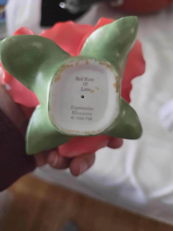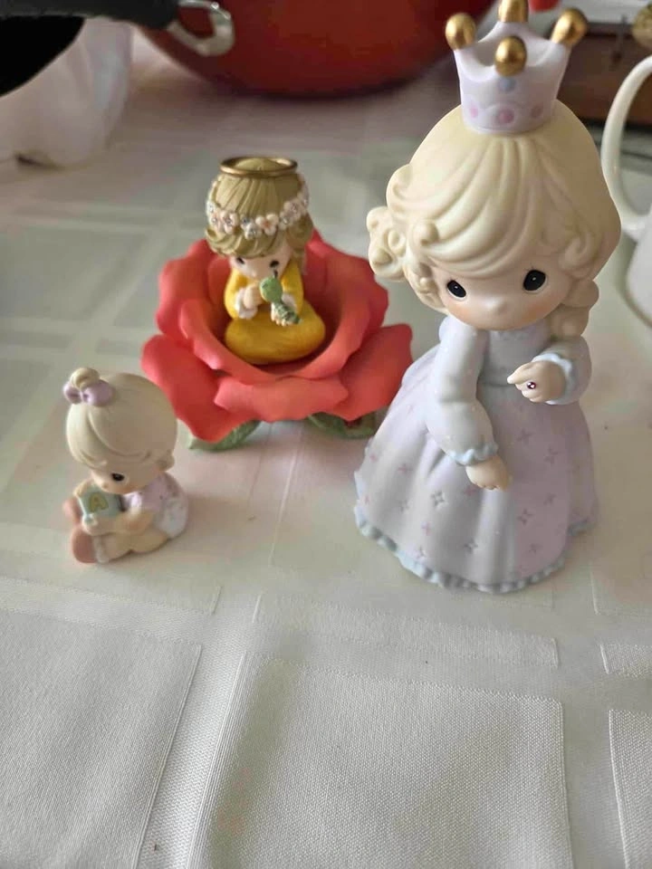 Collectible porcelain figurine set includes Pretty As A Princess, Red Rose Of Love, and a small baby girl figurine. Each piece is hand-painted with soft pastel colors and features the signature teardrop-shaped eyes. Set has a mix of matte and glossy finishes.