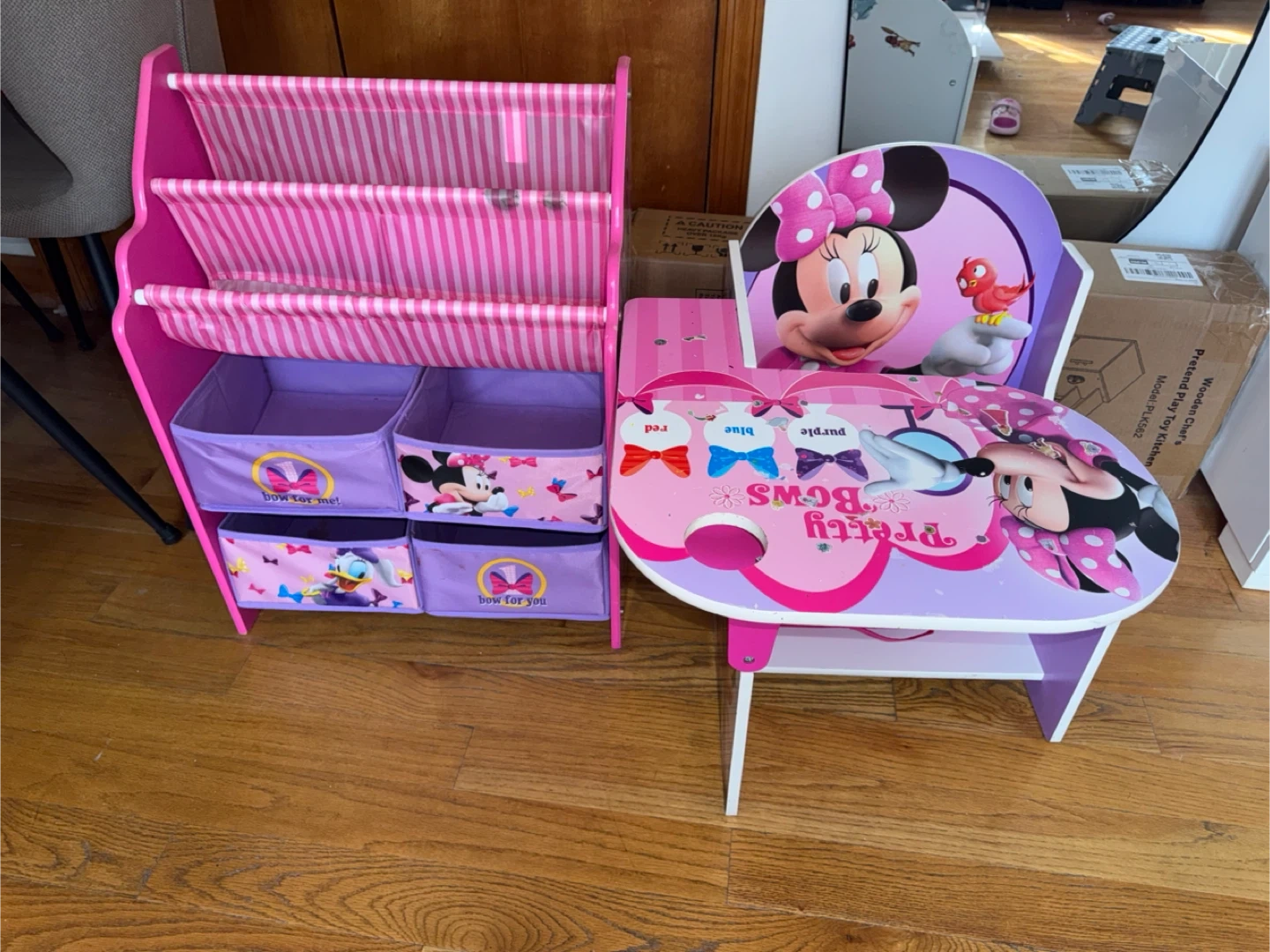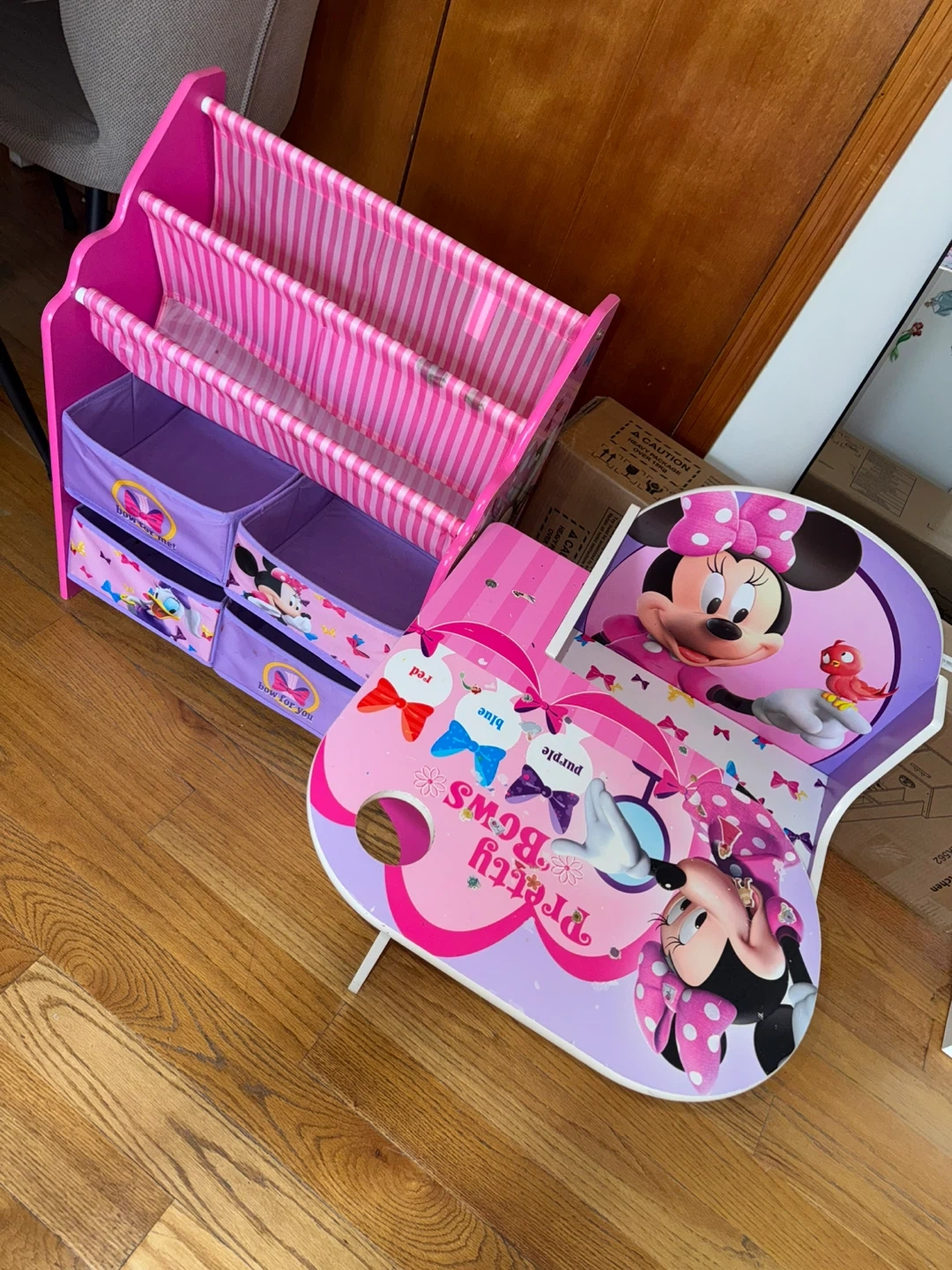 This Minnie Mouse themed desk and storage set is perfect for your little one's room! It includes a child-sized desk with a chair and a tiered storage unit with fabric bins. The set features colorful Minnie Mouse graphics and a pink and purple color scheme.