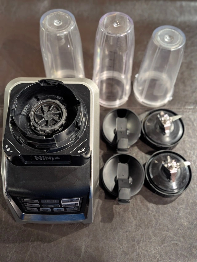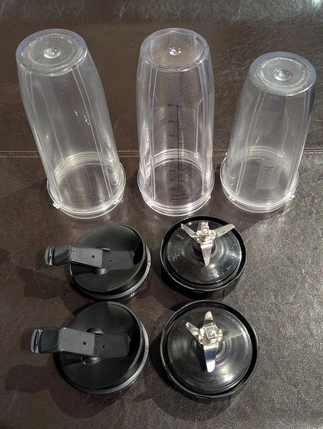 Hi everyone, Available for sale is ONE (1) Ninja Blender 1300W BL641C personal blender in very good to like new condition. Included are TWO (2) newer 32 ounce blender cups (3 total), TWO (2) newer lids, and TWO (2) newer blades. This blender is very powerful (but known to be loud) and if you respect the cup capacity limit and blend liquids thicker than water, you will have NONE of the extremely minor rumored leaking issues. Gently used, and thoroughly cleaned. From a home with NO smoking, NO pets, and NO mold. Works as it should and I'm selling it only because I am downsizing. Meet in West GTA, flexible days and times. Cash only, no trades please.