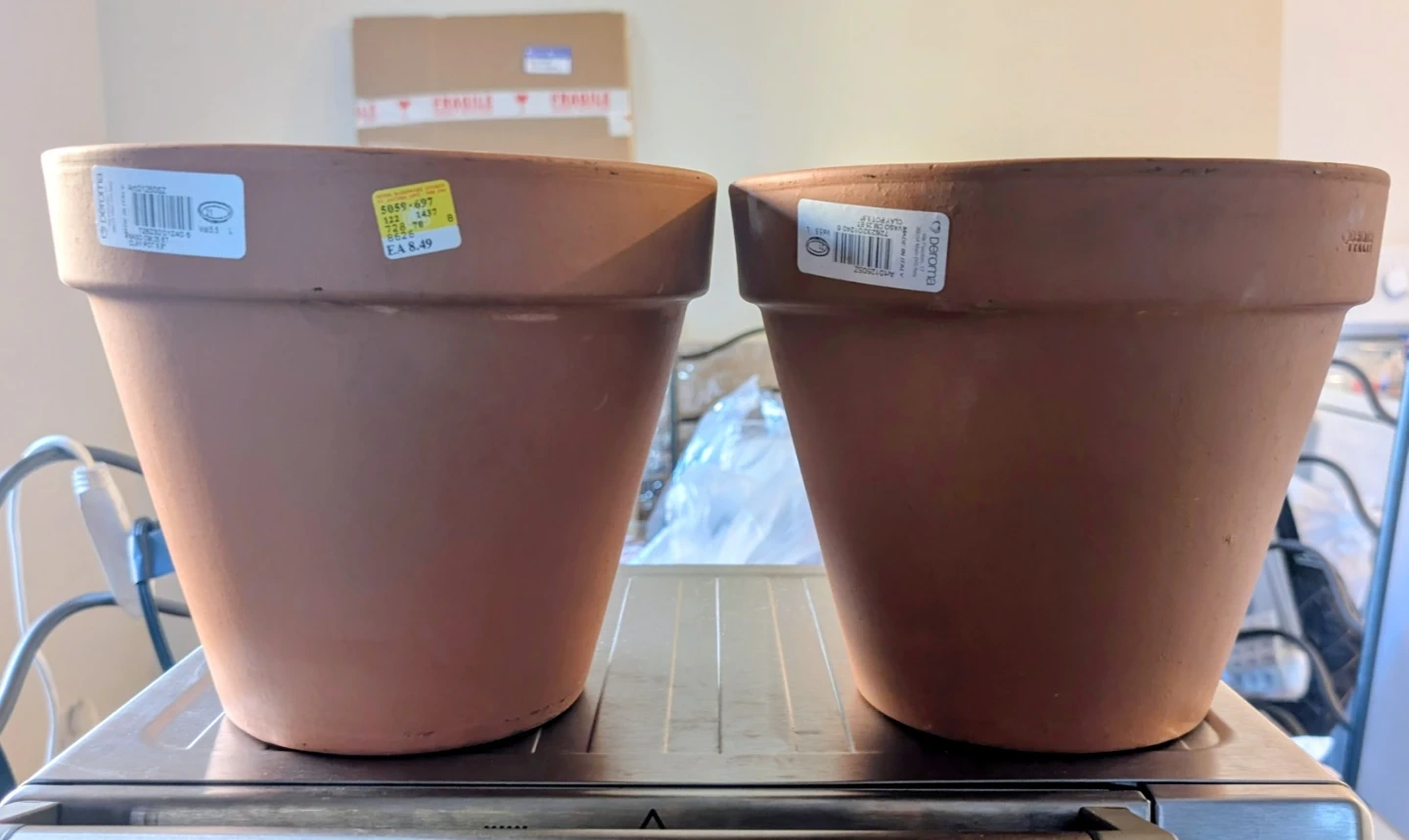 These are two Deroma terracotta plant pots. They're made in Italy and are 9.8 inches. Clay material. Brand new. Paid $8.49 each. Selling for $10 for both.