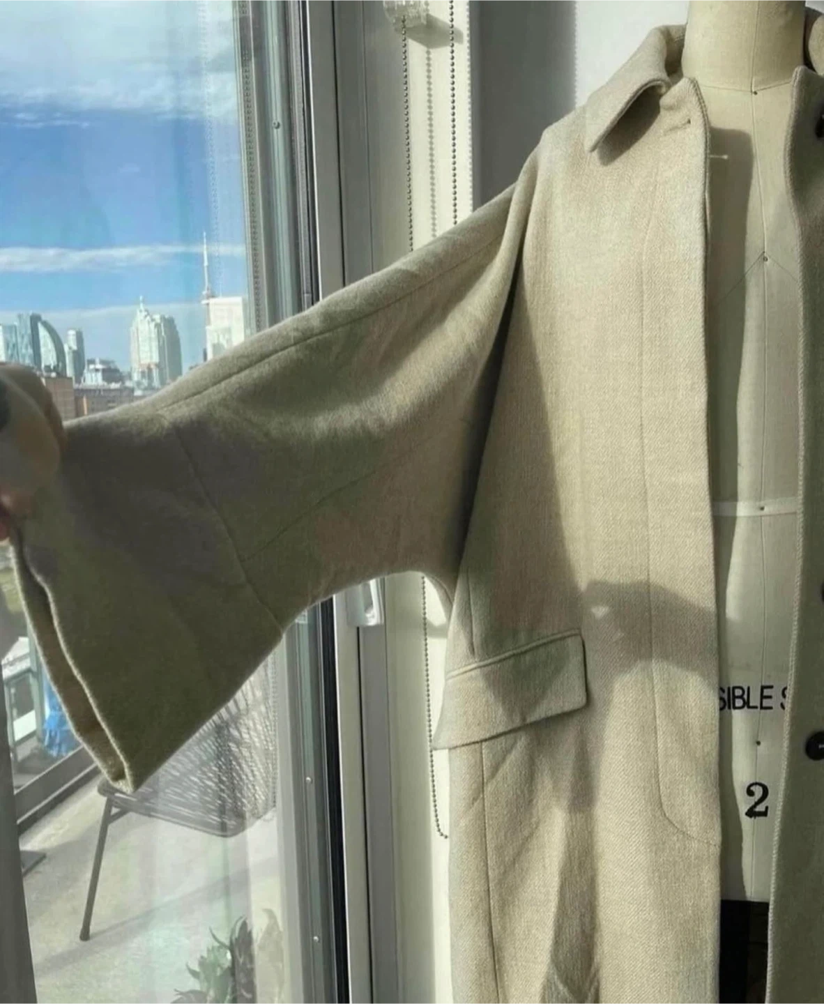 Stylish long beige coat with button closure and two front pockets. It's made of a wool-blend material, perfect for cooler weather. This coat is a versatile addition to any wardrobe!