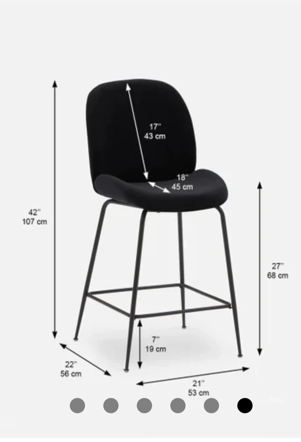 Two black upholstered bar stools with metal legs. These stools measure 17" (43 cm) high at the back and have a seat depth of 18" (45 cm). The seat width is 21" (53 cm) and the overall height is 42" (107 cm). They'd be great for a kitchen island or home bar!