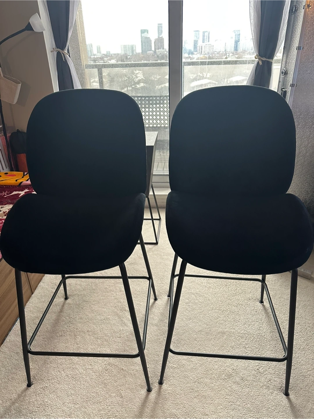 Two black upholstered bar stools with metal legs. These stools measure 17" (43 cm) high at the back and have a seat depth of 18" (45 cm). The seat width is 21" (53 cm) and the overall height is 42" (107 cm). They'd be great for a kitchen island or home bar!
