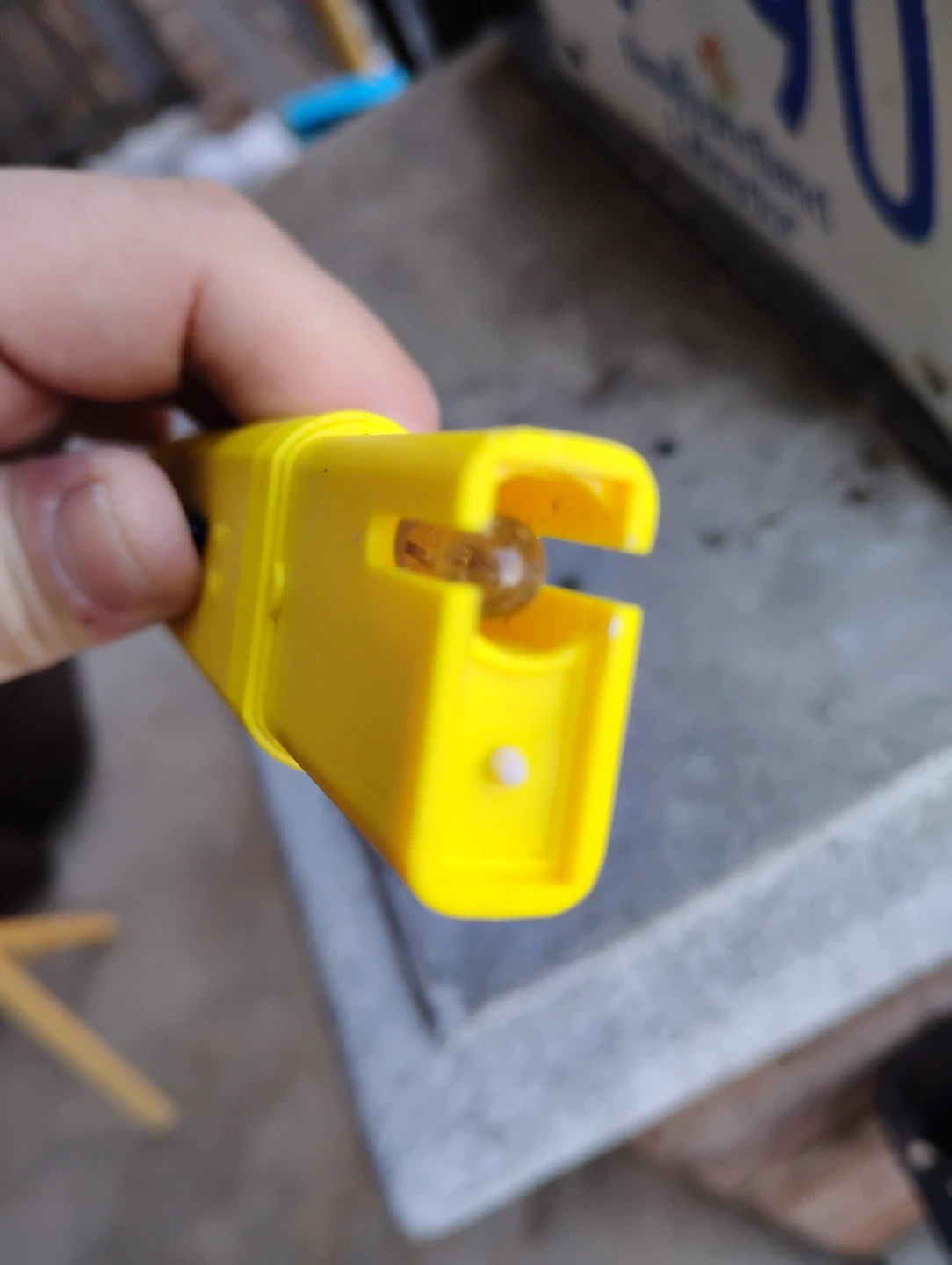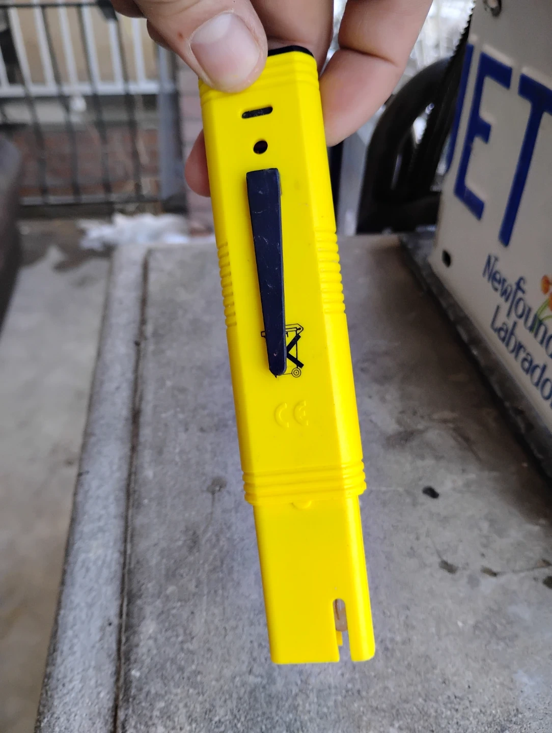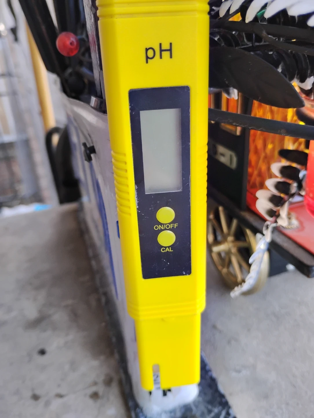 This is a digital pH meter tester. It's yellow and has an LCD screen. The device has ON/OFF and CAL buttons.