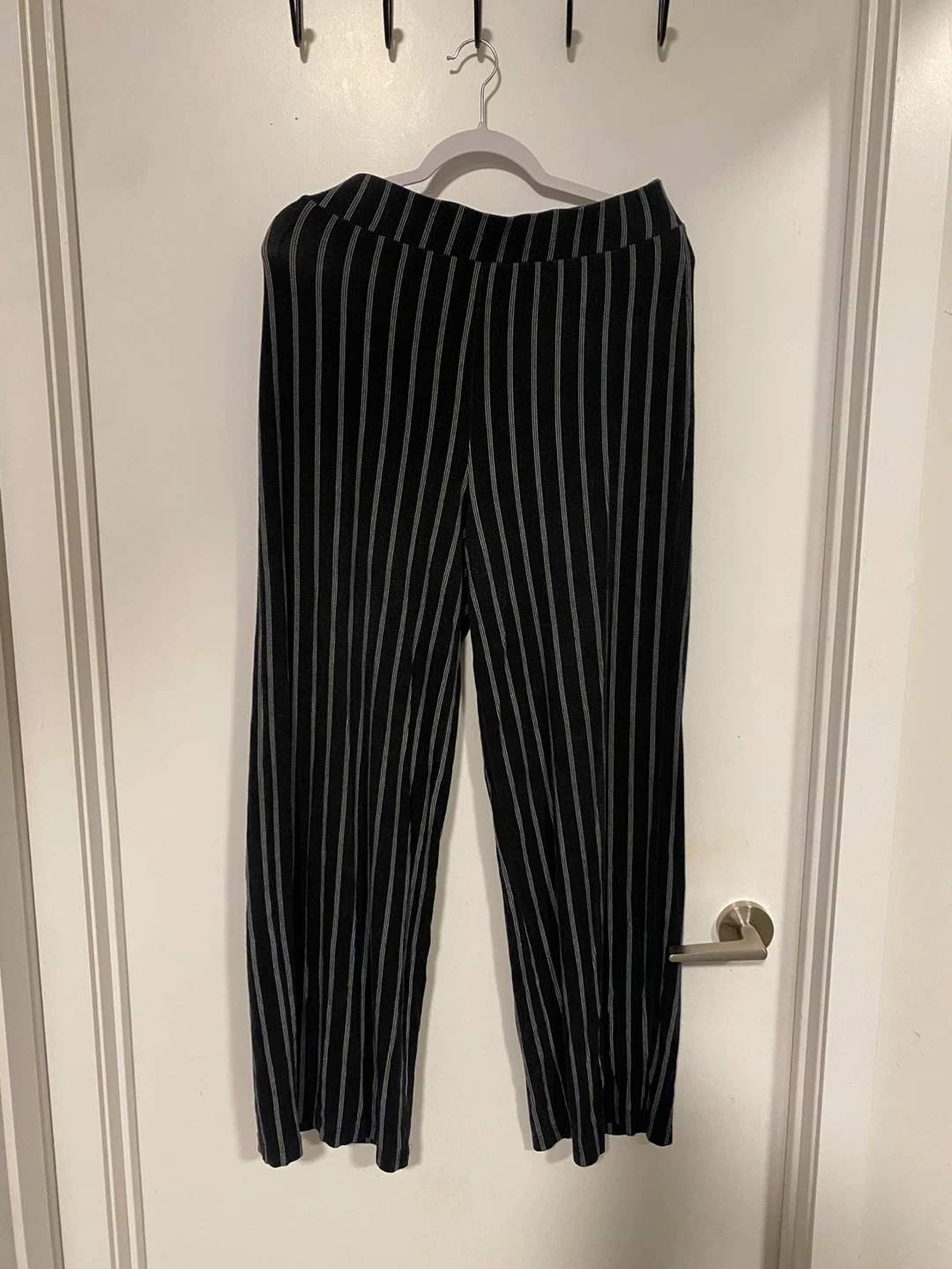 Comfy, black and striped pants. These have a wide leg style very stretchy and comfortable. Super easy to dress up or down. Well loved. Size M – L.