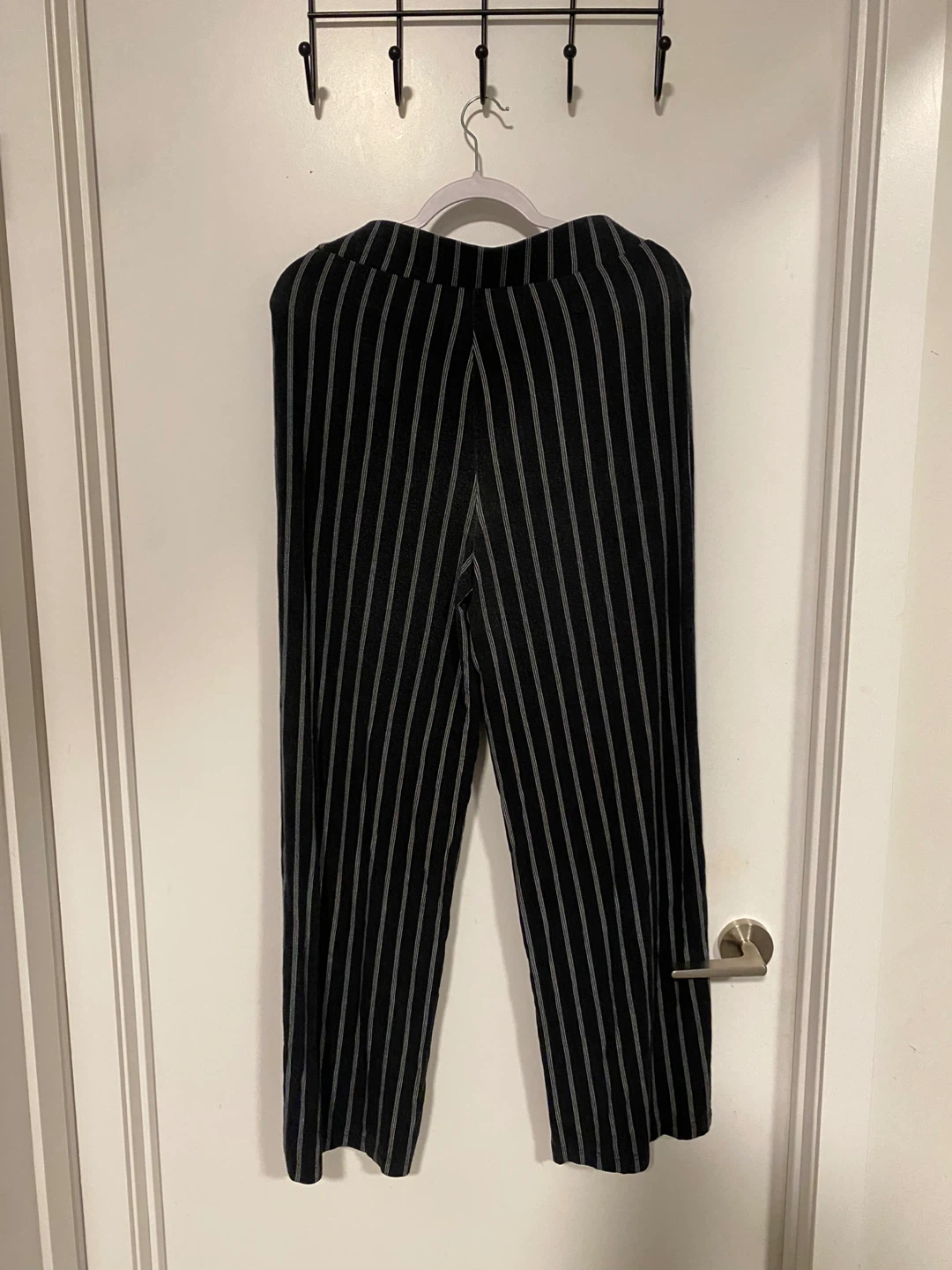 Comfy, black and striped pants. These have a wide leg style very stretchy and comfortable. Super easy to dress up or down. Well loved. Size M – L.