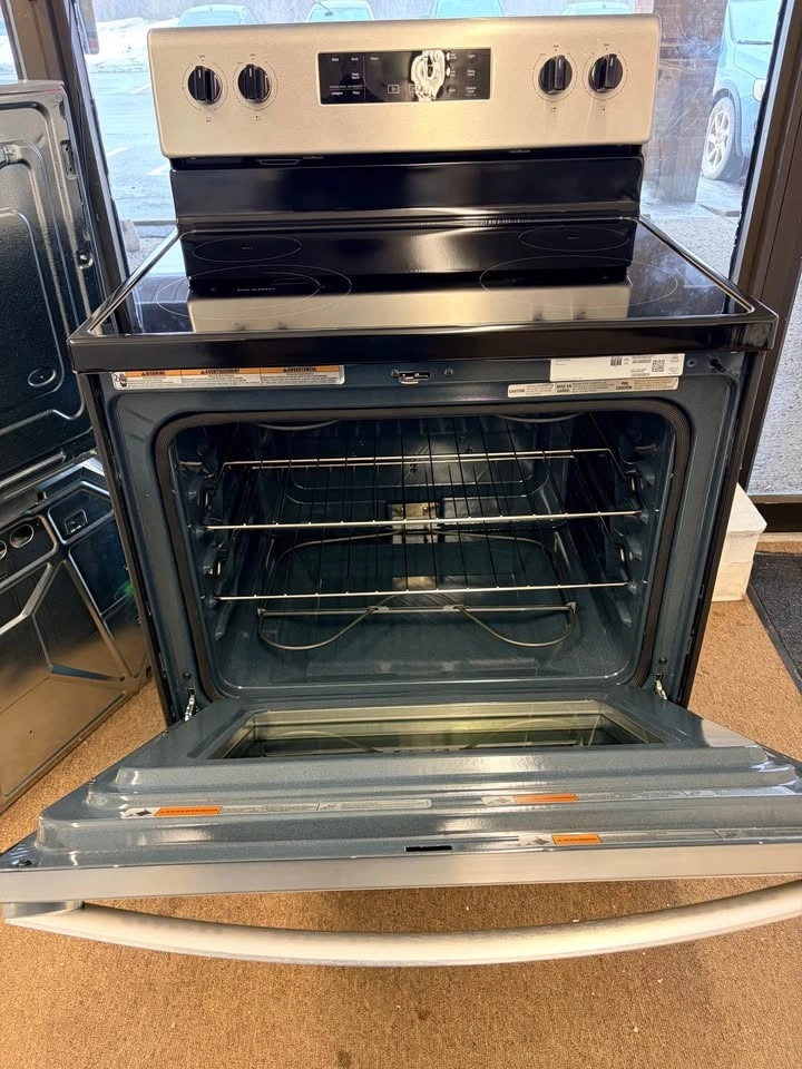 Clean Whirlpool electric range for sale. This stainless steel appliance has a sleek black glass cooktop with multiple elements, including a dual element. Oven interior is super clean and has all its racks. Digital controls and knobs are easy to use. Great for cooking up all your meals! Feel free to message if you have any questions!