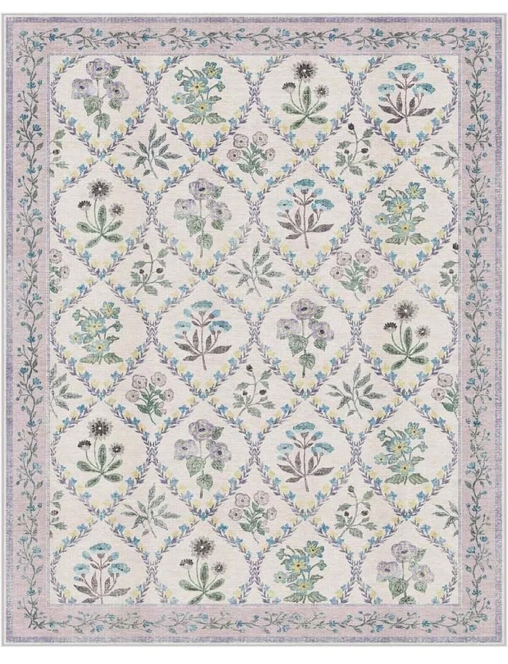 Brand new 8x10 washable area rug. Perfect for living room, bedroom, dining room, kitchen, office, or nursery. Features a boho floral vintage design in purple and grey. Low pile, soft, thin, and non-slip.