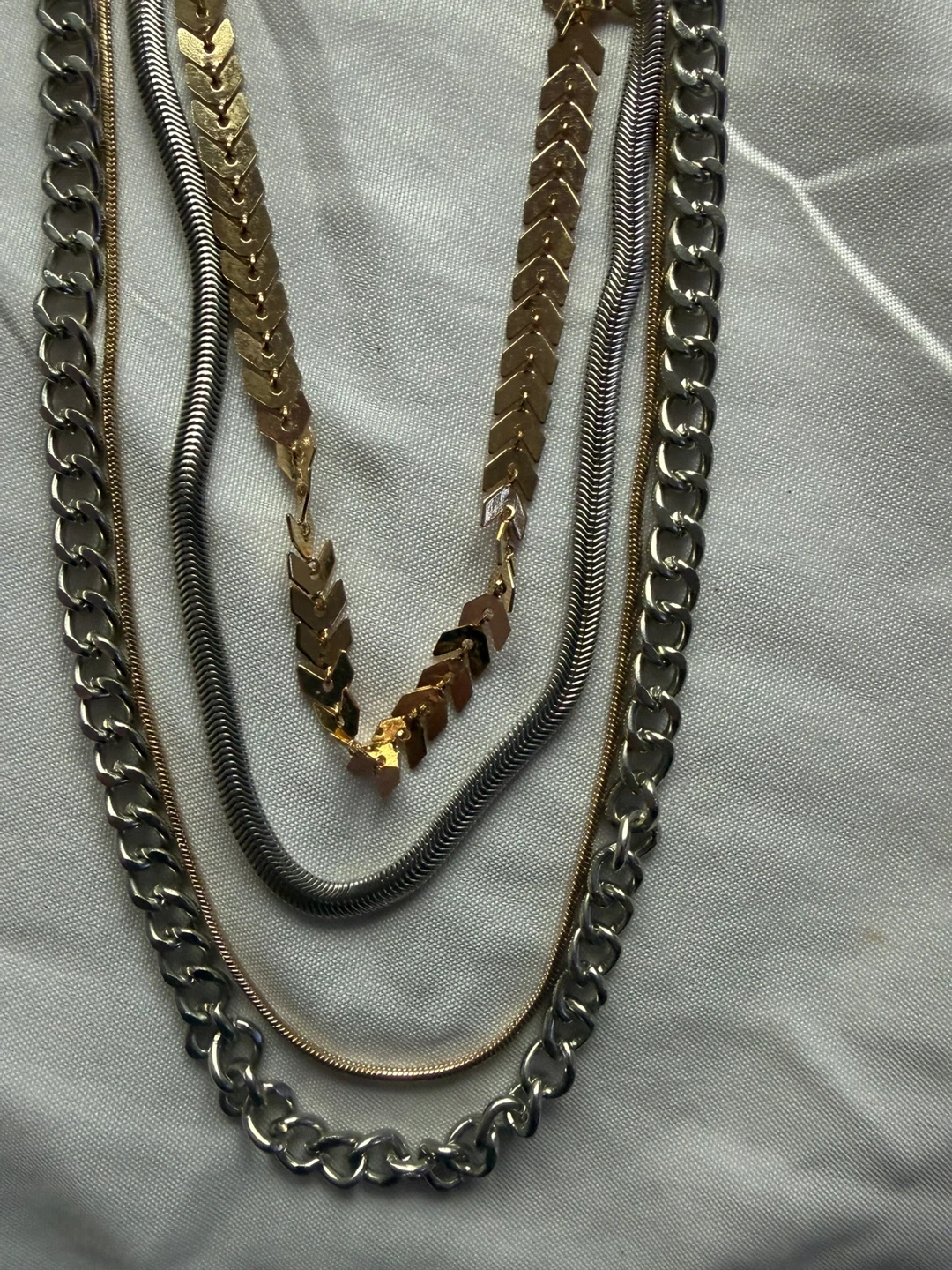 This vintage layered necklace features multiple chains in gold and silver tones. It includes various chain styles like snake chain and curb chain. The necklace has a lobster clasp closure.(good fantasy jewerly)(A gift I get in 2012 year)
