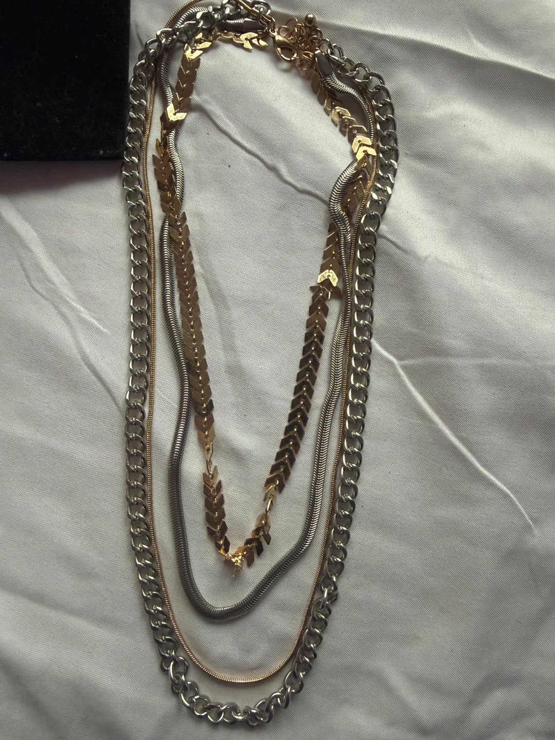 This vintage layered necklace features multiple chains in gold and silver tones. It includes various chain styles like snake chain and curb chain. The necklace has a lobster clasp closure.(good fantasy jewerly)(A gift I get in 2012 year)