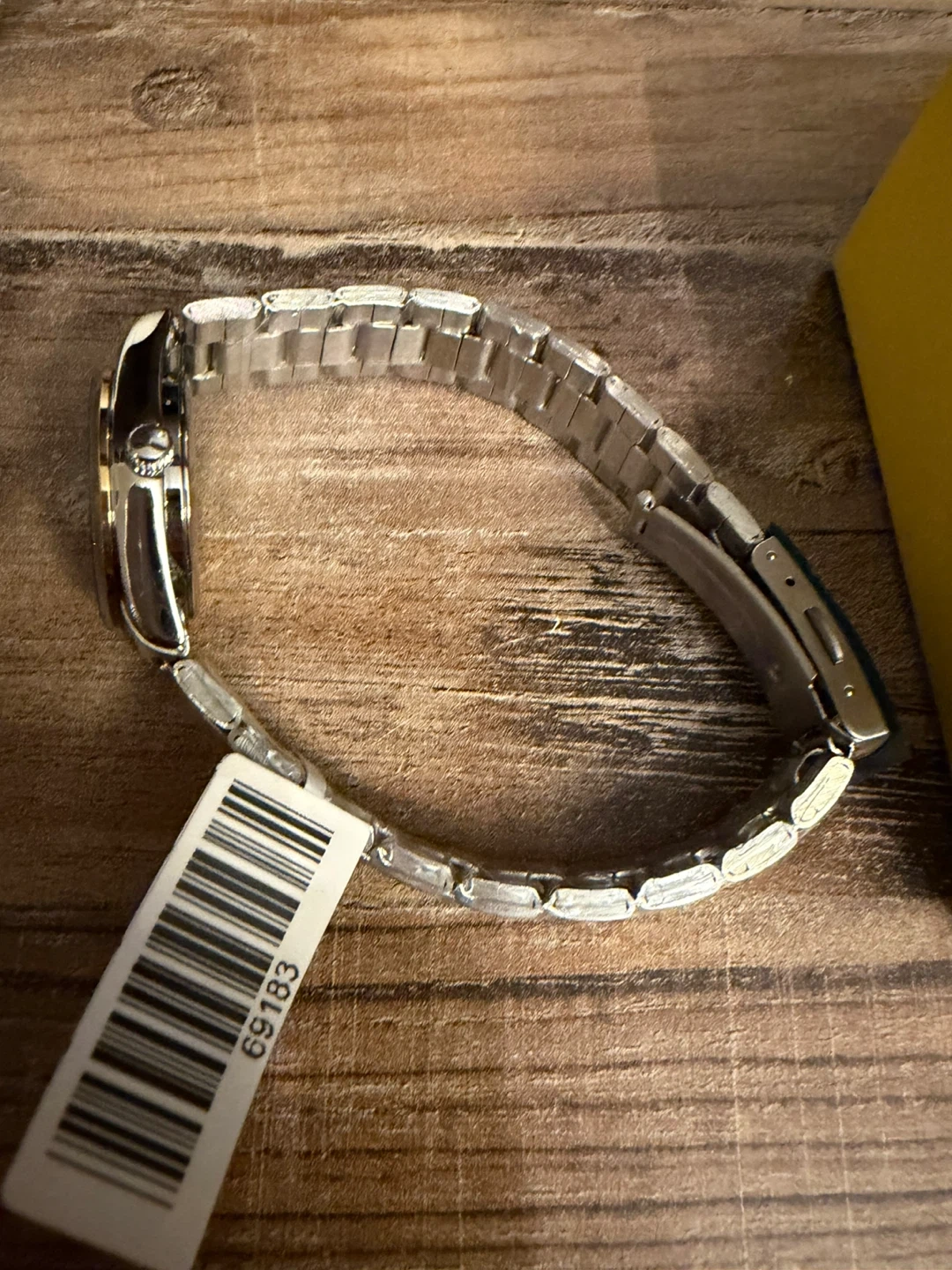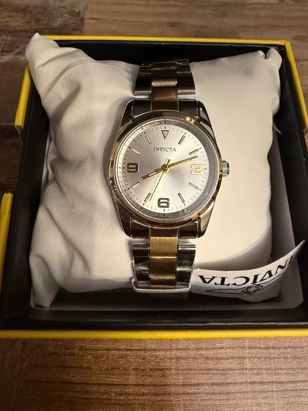 This brand new in box Invicta watch features a two-tone stainless steel band with silver and gold accents. It has a silver dial with gold-tone hour markers and hands. Free gift yellow travel