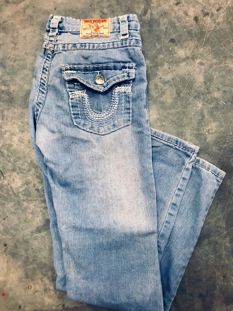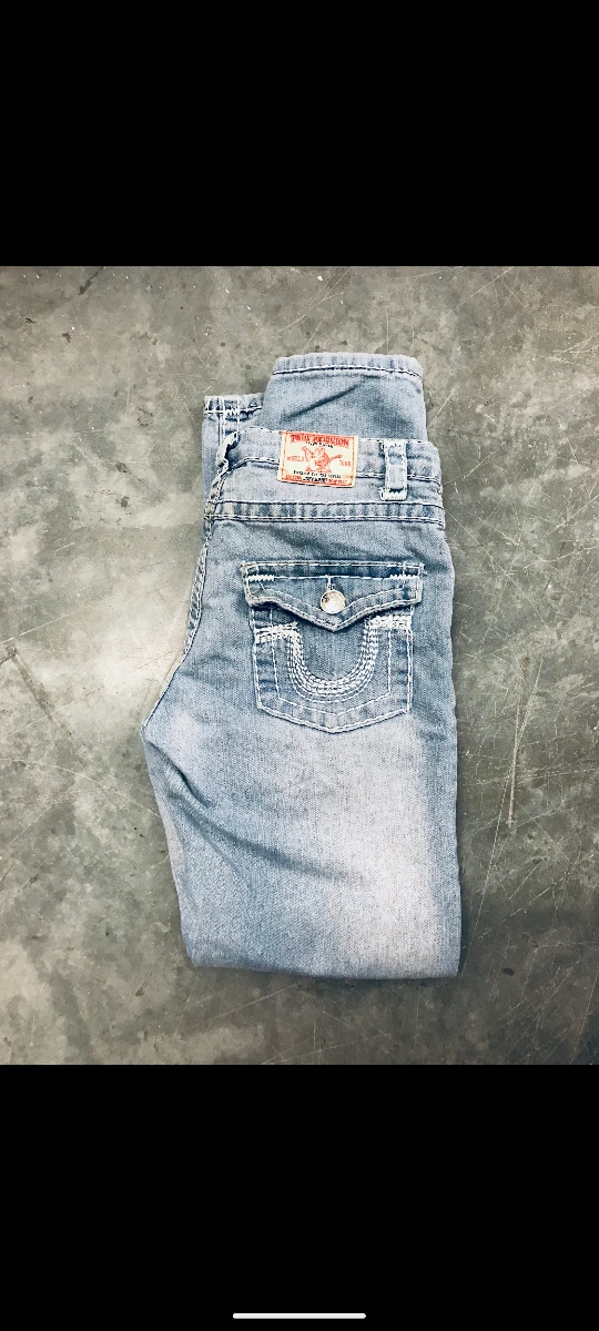 These jeans are in great condition. They are a size 27 and have a light blue wash. They feature the iconic True Religion stitching and logo.