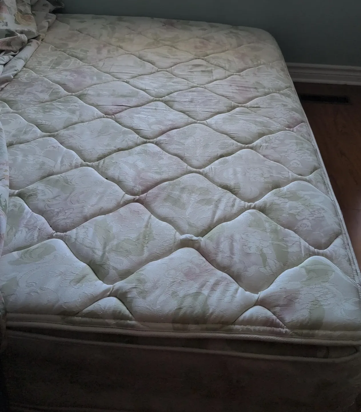 This is a used mattress with a floral pattern. It has a quilted surface and is placed on a box spring. It's a standard size mattress.