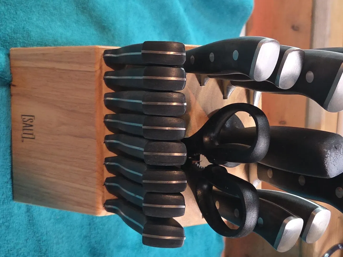 Selling a SALI knife block set. It appears to be in good condition and includes a variety of knives and a pair of kitchen scissors. Perfect for any kitchen!